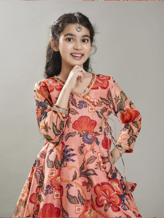 Peach Floral printed Angrakha style Kurta has a V-neck, three-quarter regular sleeves, Above knee length with flared hem with Elasticated waistband Sharara