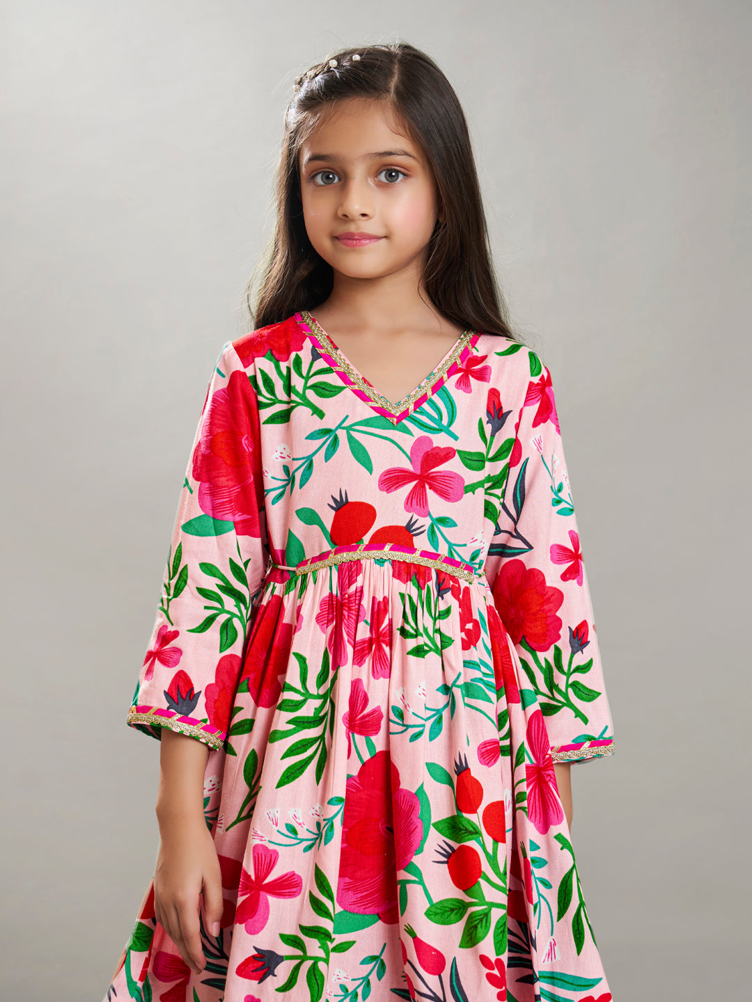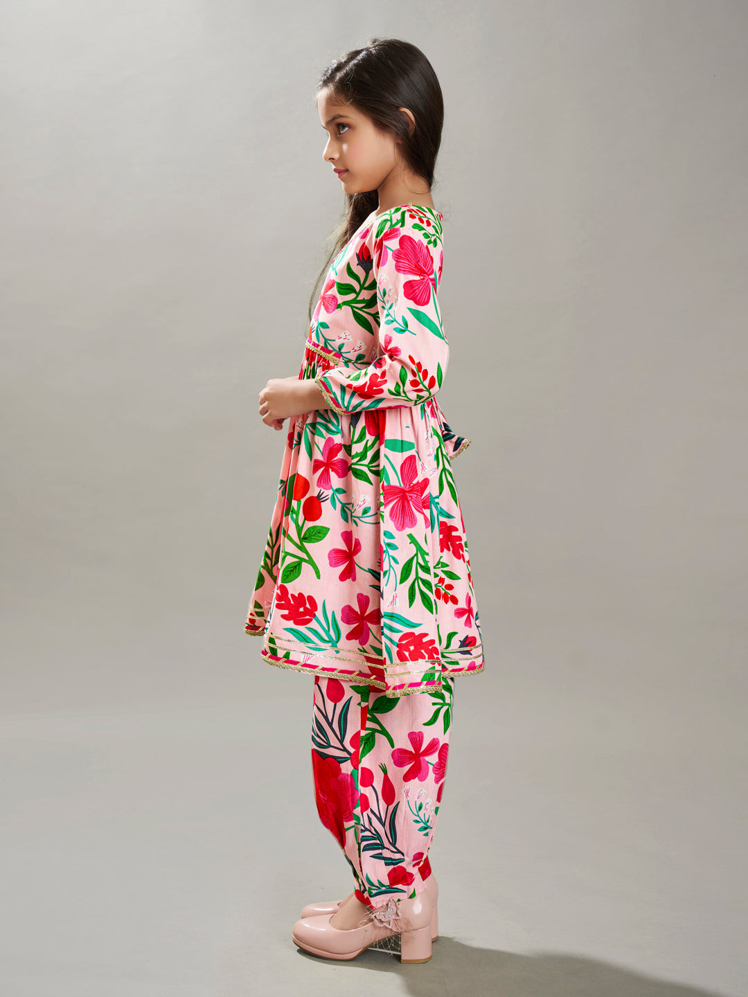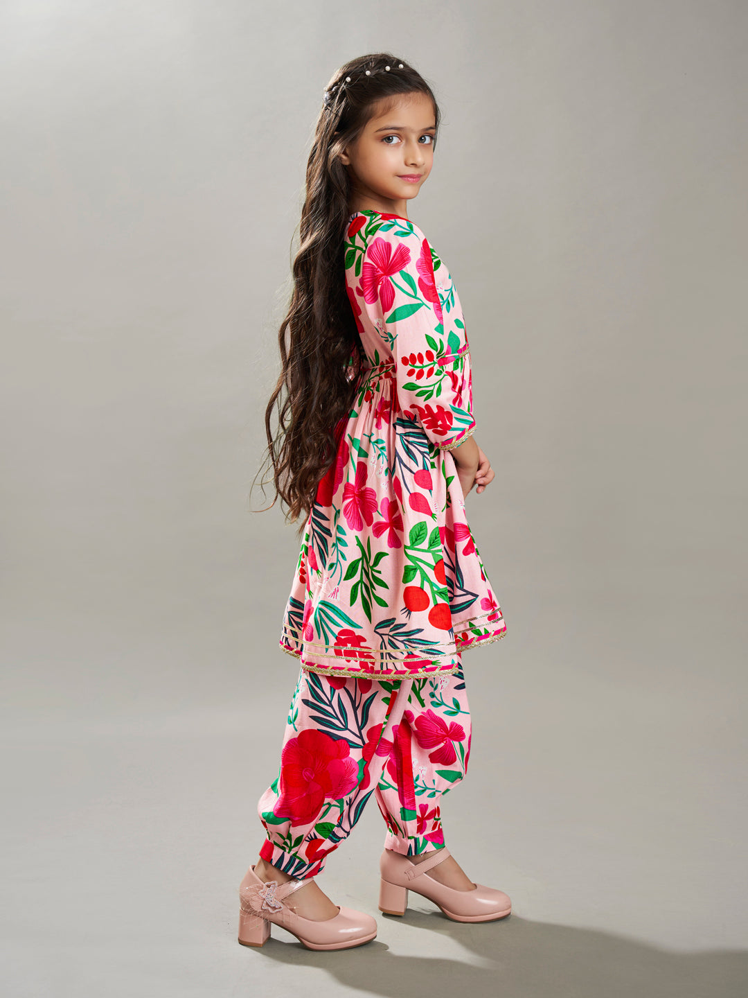 Girls Peach Multi Floral Printed Cotton Kurta with Trousers set