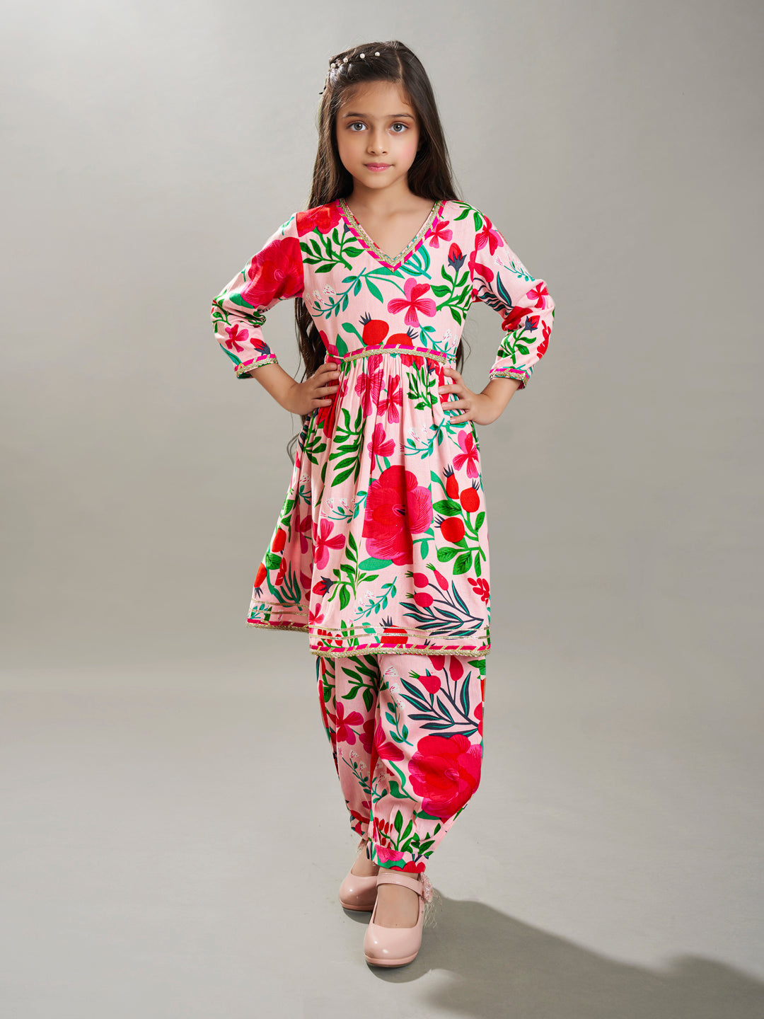 Pink Floral Printed Anarkali shape Kurta has a V-Neck, three-quarter regular sleeves, Above knee length with flared hem with Elasticated waistband Pant .