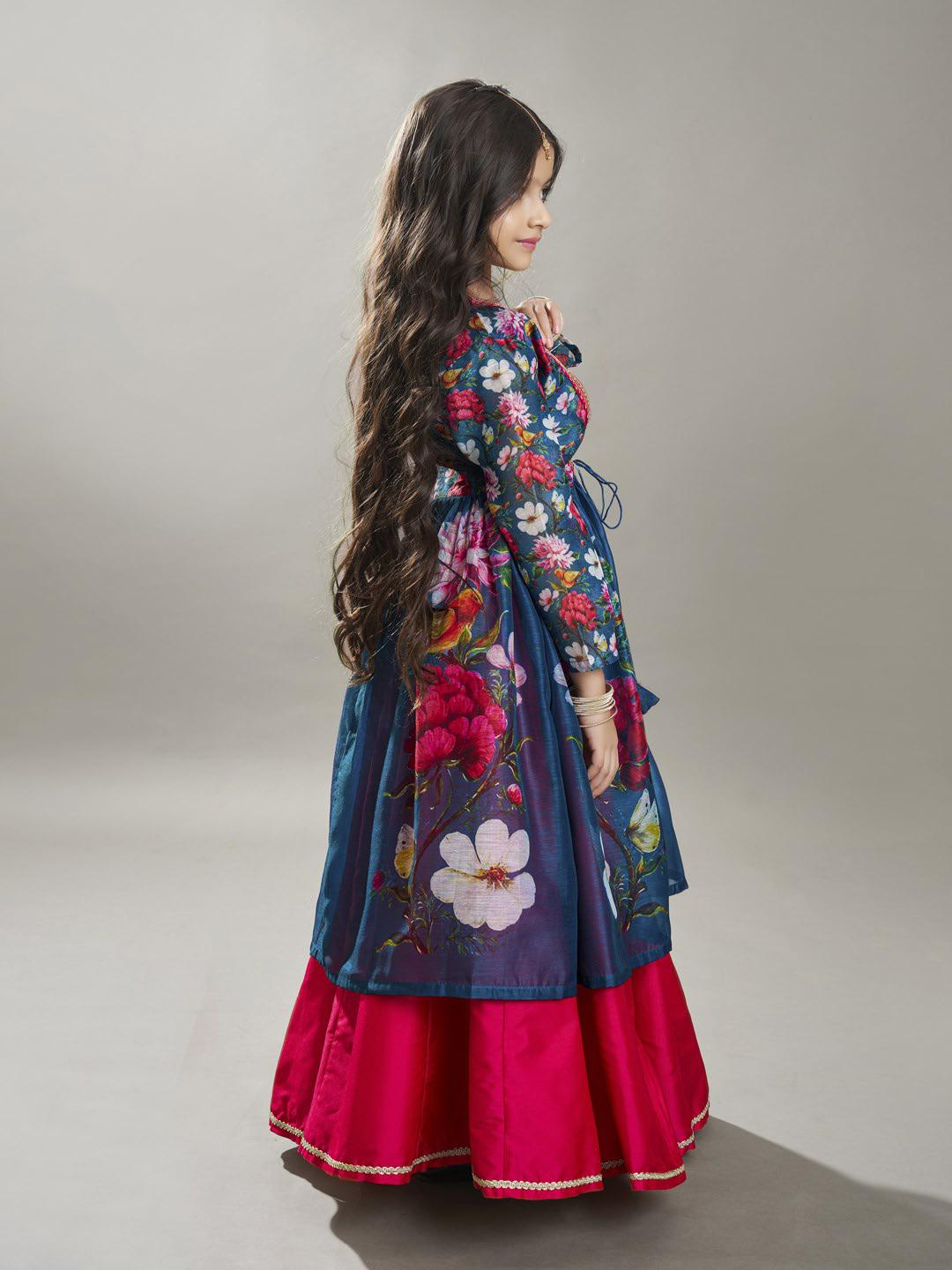 Pink & Blue Flower Digital Print Lehenga Choli, has a Lace Detailed, has a Square Neck With Three-Quarter Sleeves, Pink Soild Skirts with Lace Detailed, has slip-on closure, flared hem