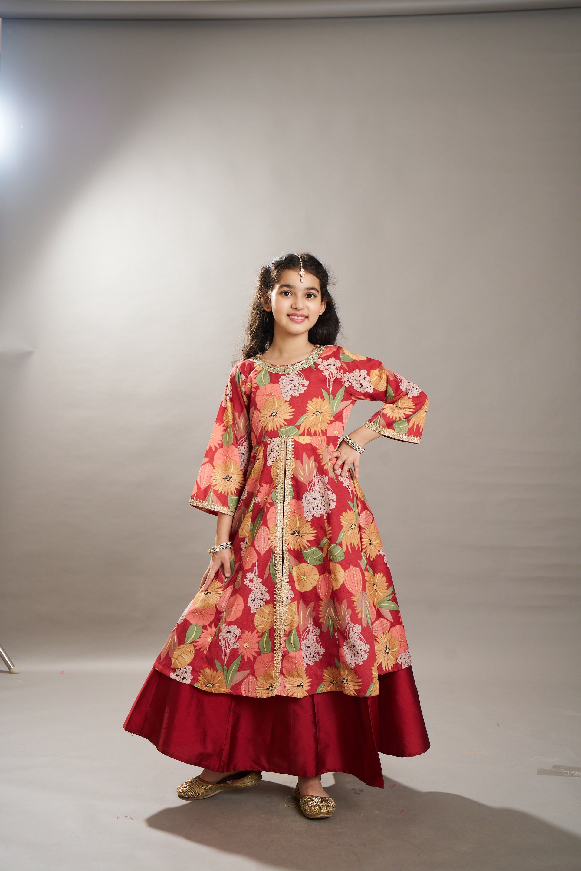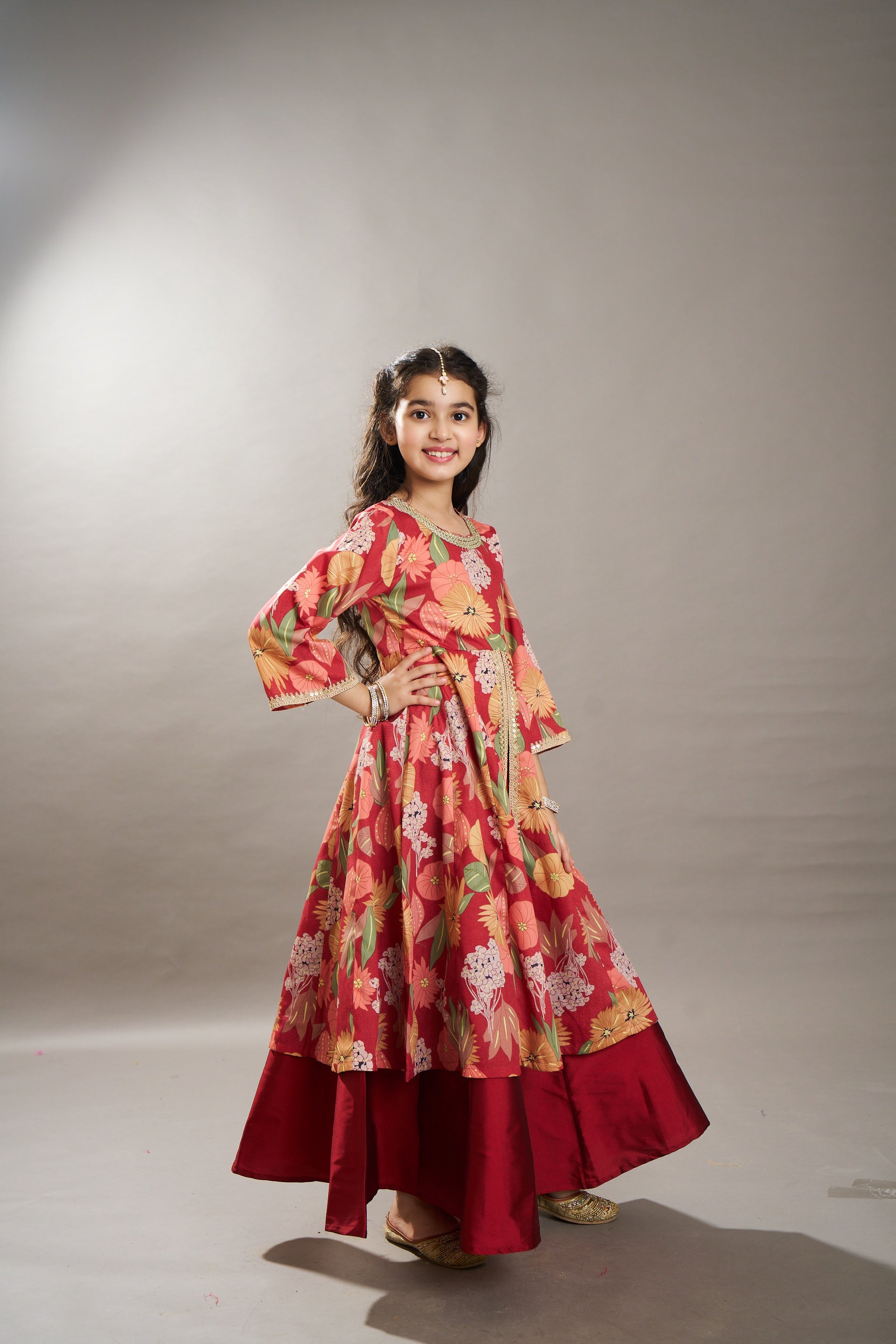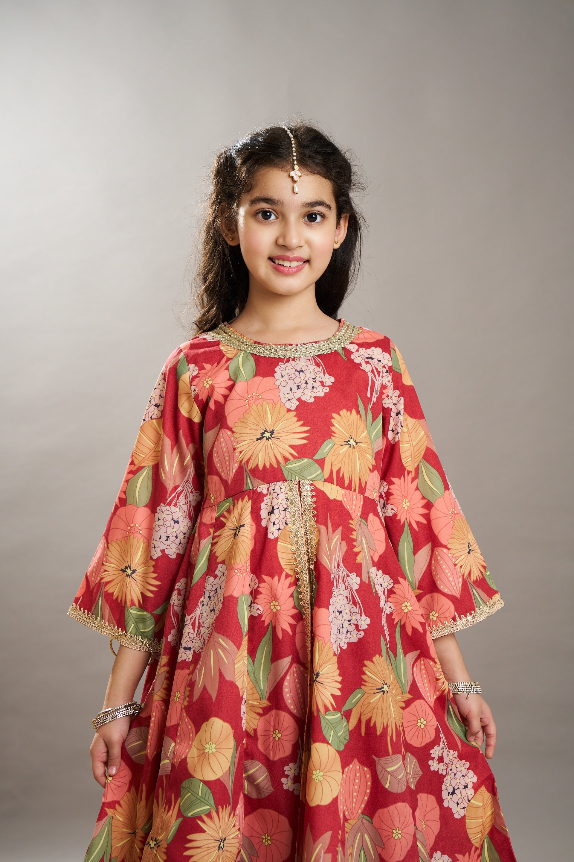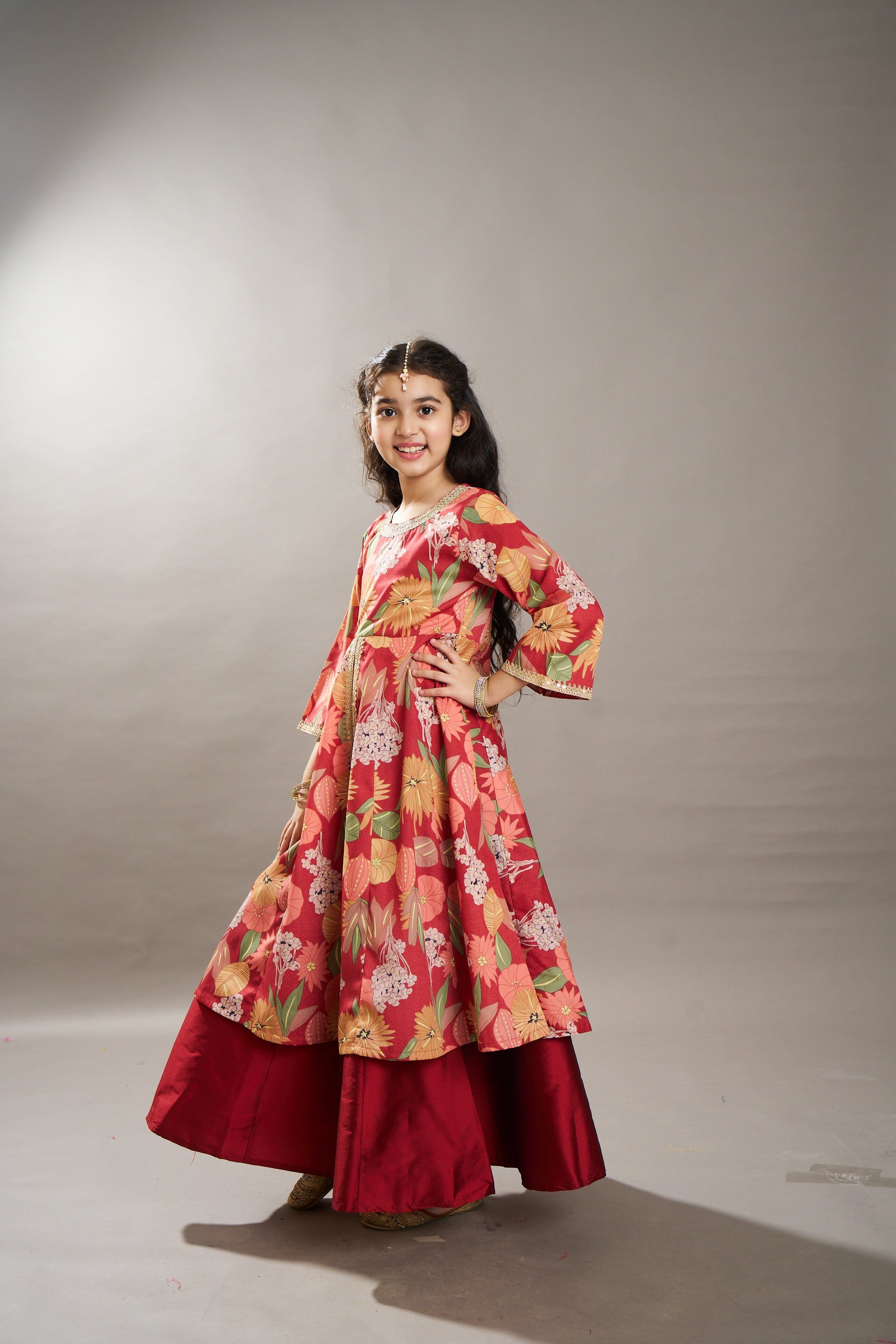 Maroon & Multi Floral Printed kurta Lace detailed has a Round Neck with Three-Quarter Sleeves, Maroon Soild Lehenga with Lace detailed