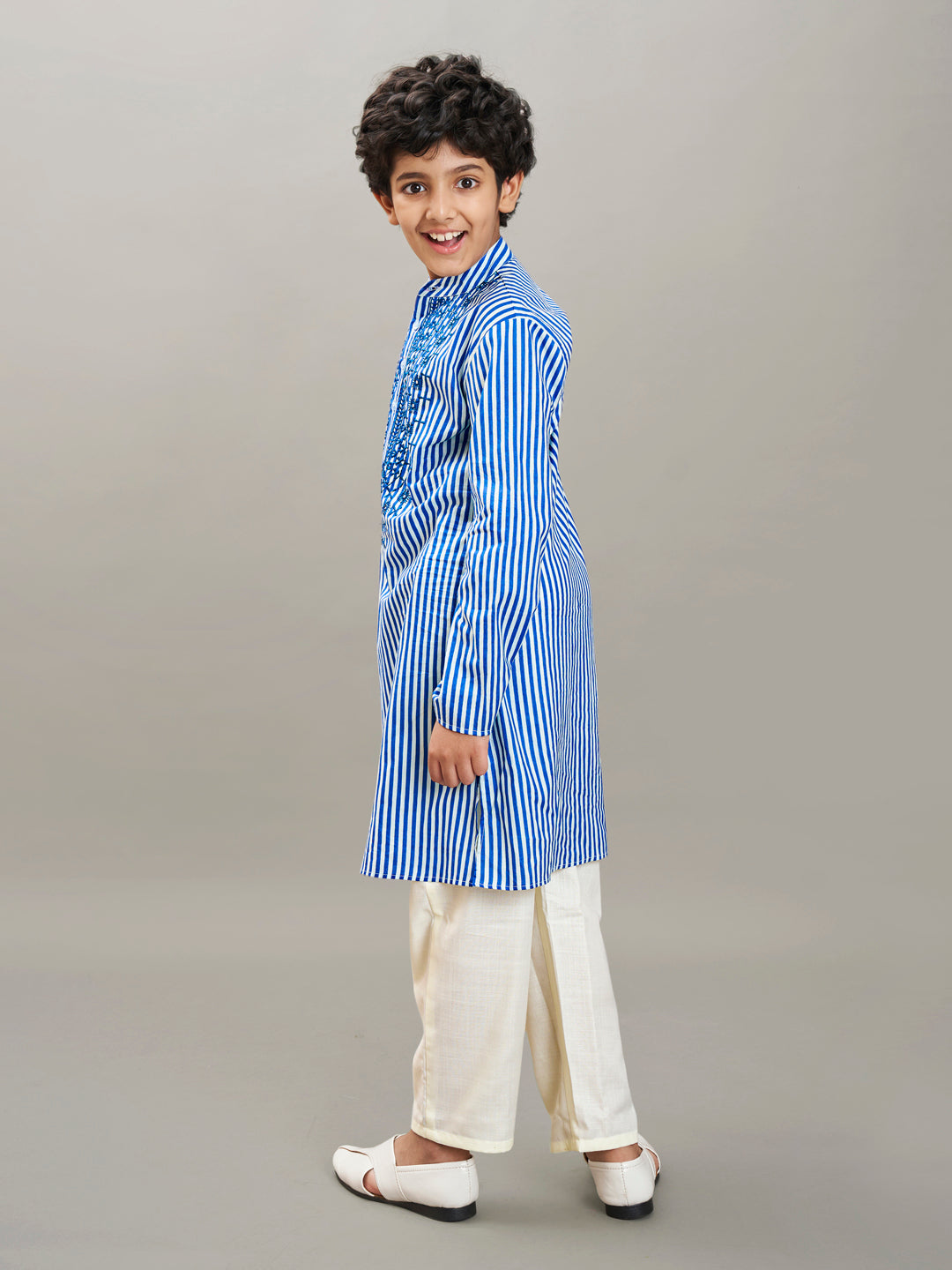 Blue & white stripe embroidery kurta paired with a off white pajama, featuring a classic collar neck design. Blue stipe cotton fabric, the kurta or casual wear, this outfit blends comfort with timeless style."