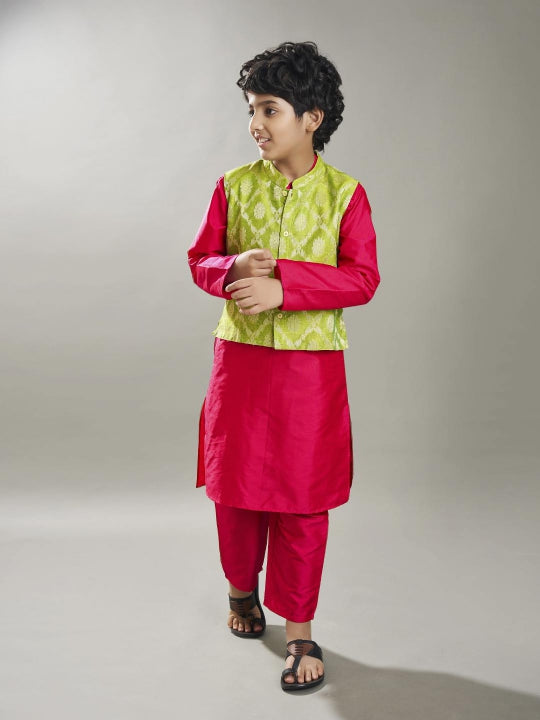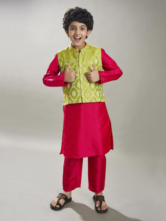Boys off Pink kurta pajama with a green jacquard booti jacket