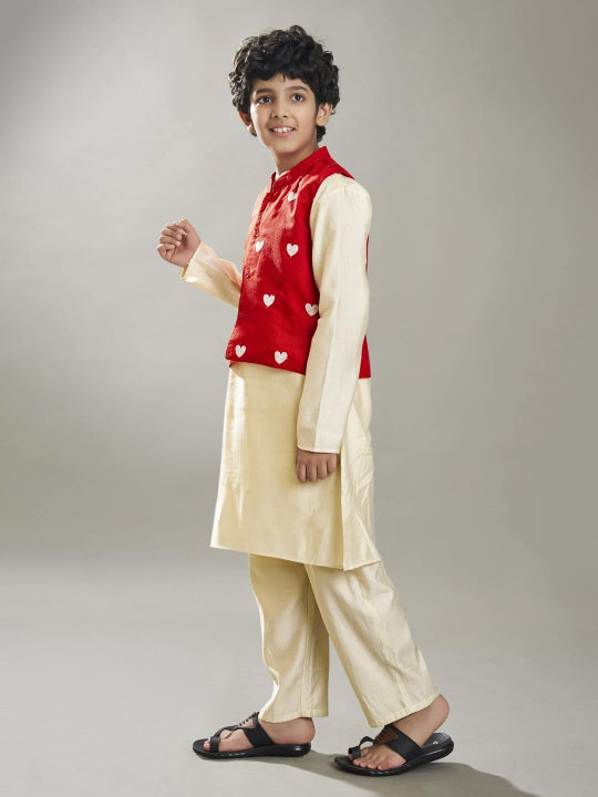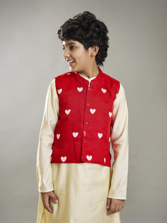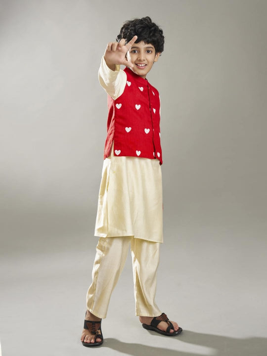 Off-white kurta pajama paired with a red embroidery jacket. The outfit features a collared neck, long sleeves, and a straight-cut pocket design on both the kurta and the jacket, blending traditional elegance with modern style.