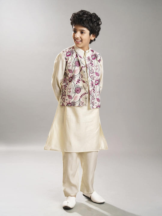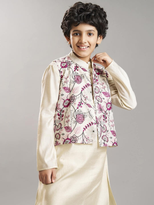 off-white kurta pajama paired with a modal booti embroidery jacket. The intricate booti embroidery adds a subtle yet elegant touch, enhancing the traditional appeal of the outfit. Designed with a smart collar neck, the jacket brings structure and sophistication to the look