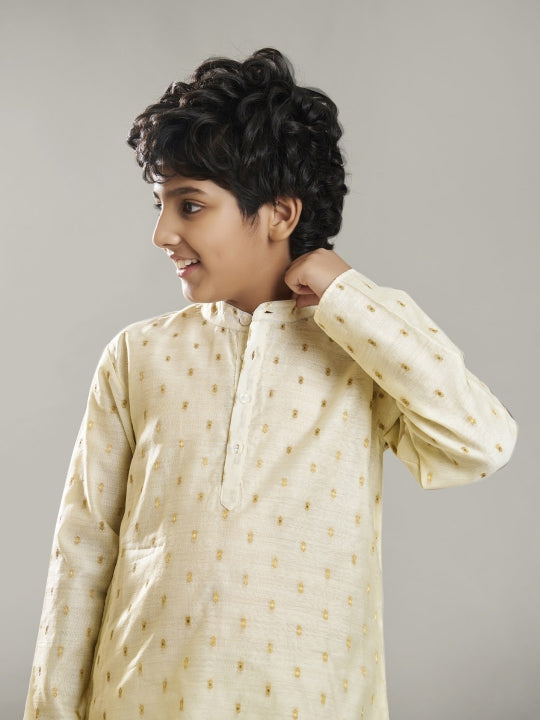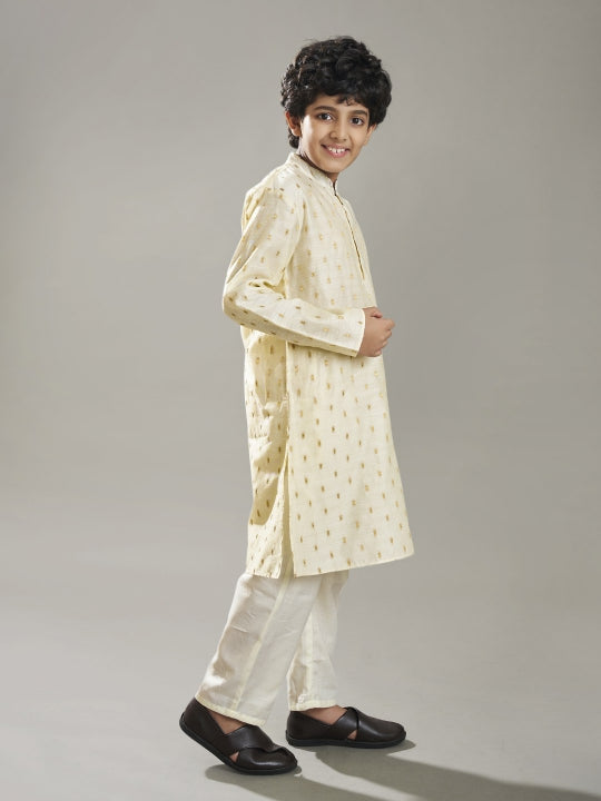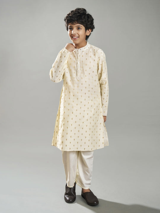 off-white modal booti kurta paired with a matching pajama, with collar neck & regular sleeves.