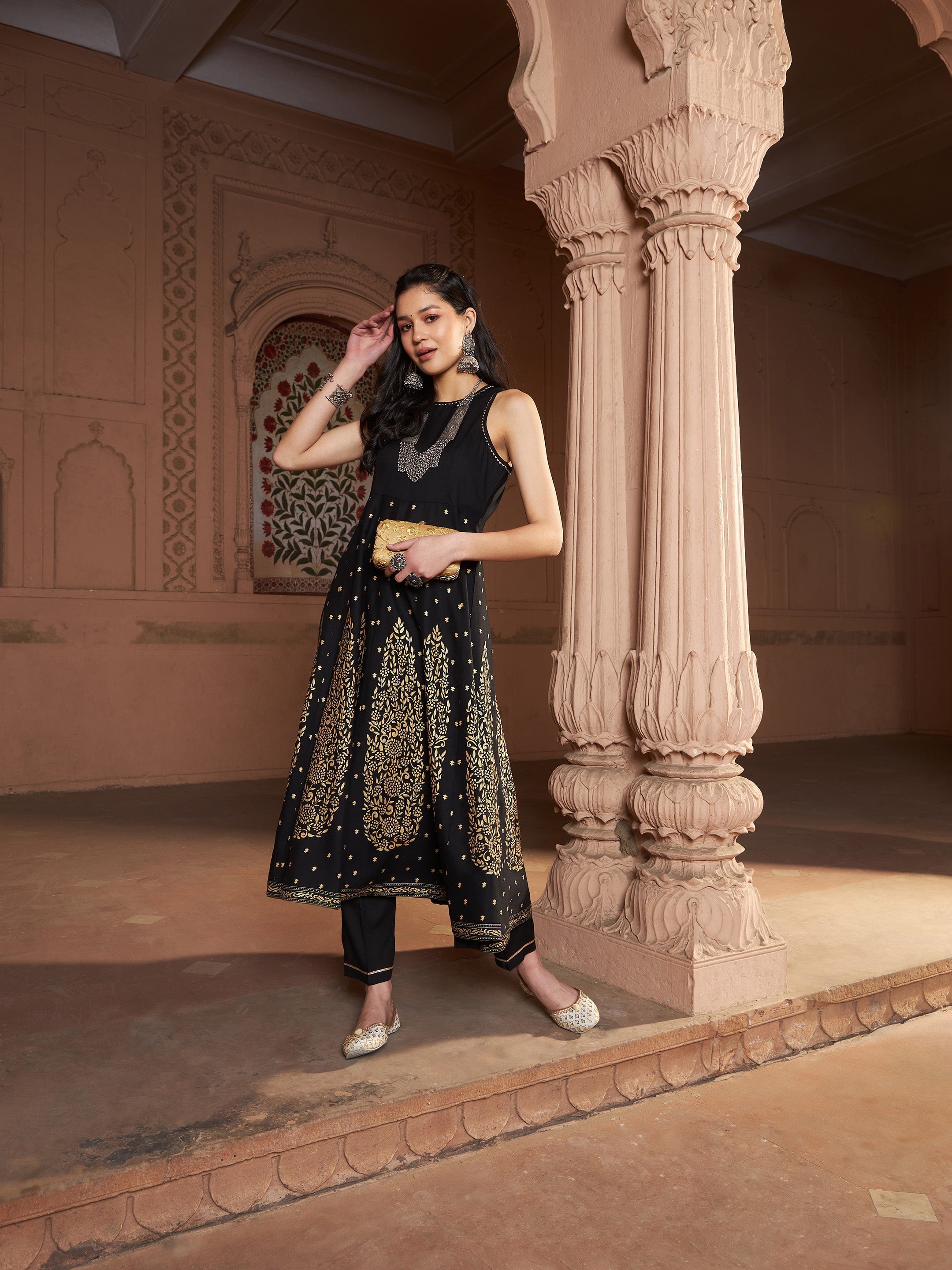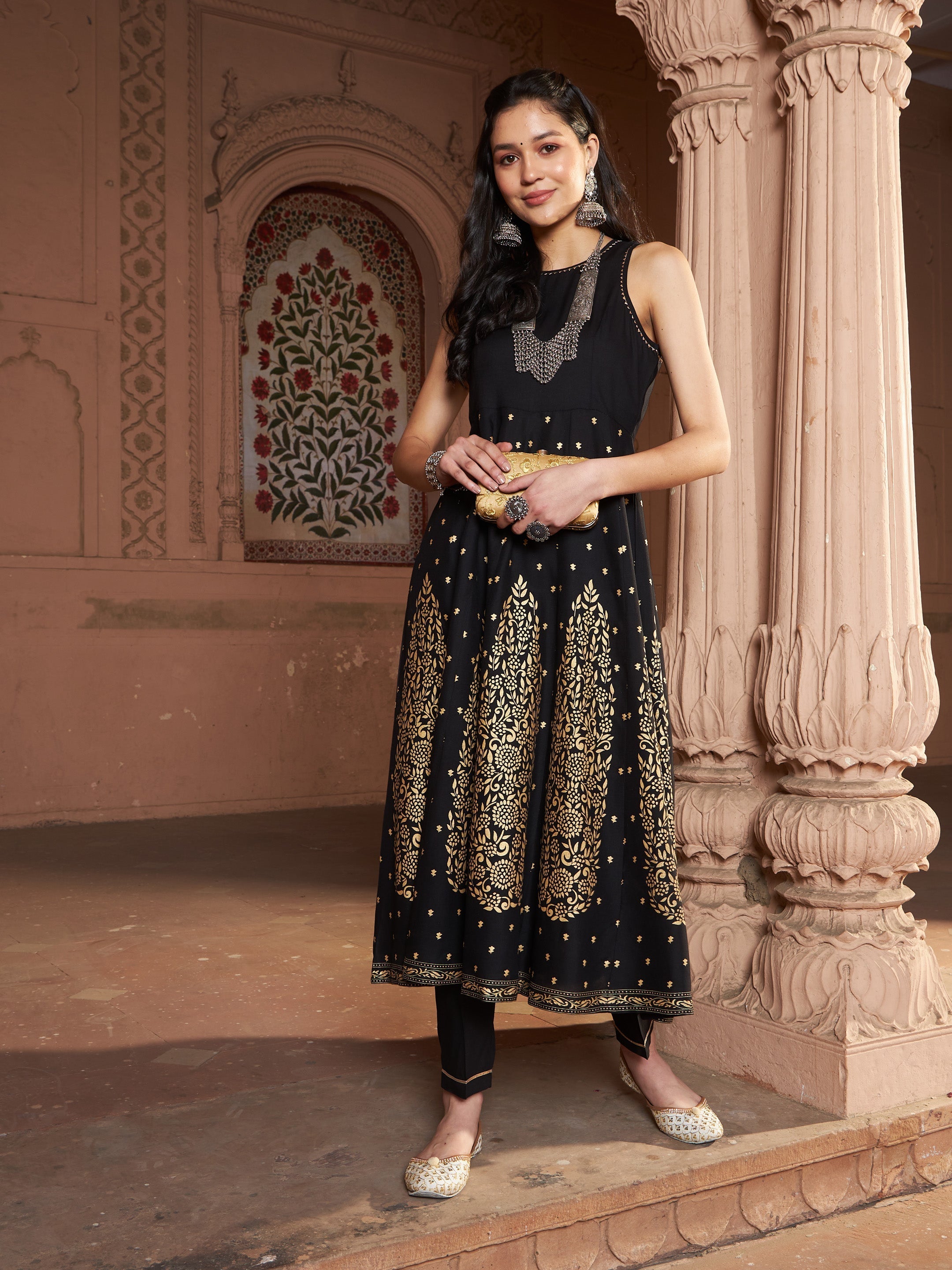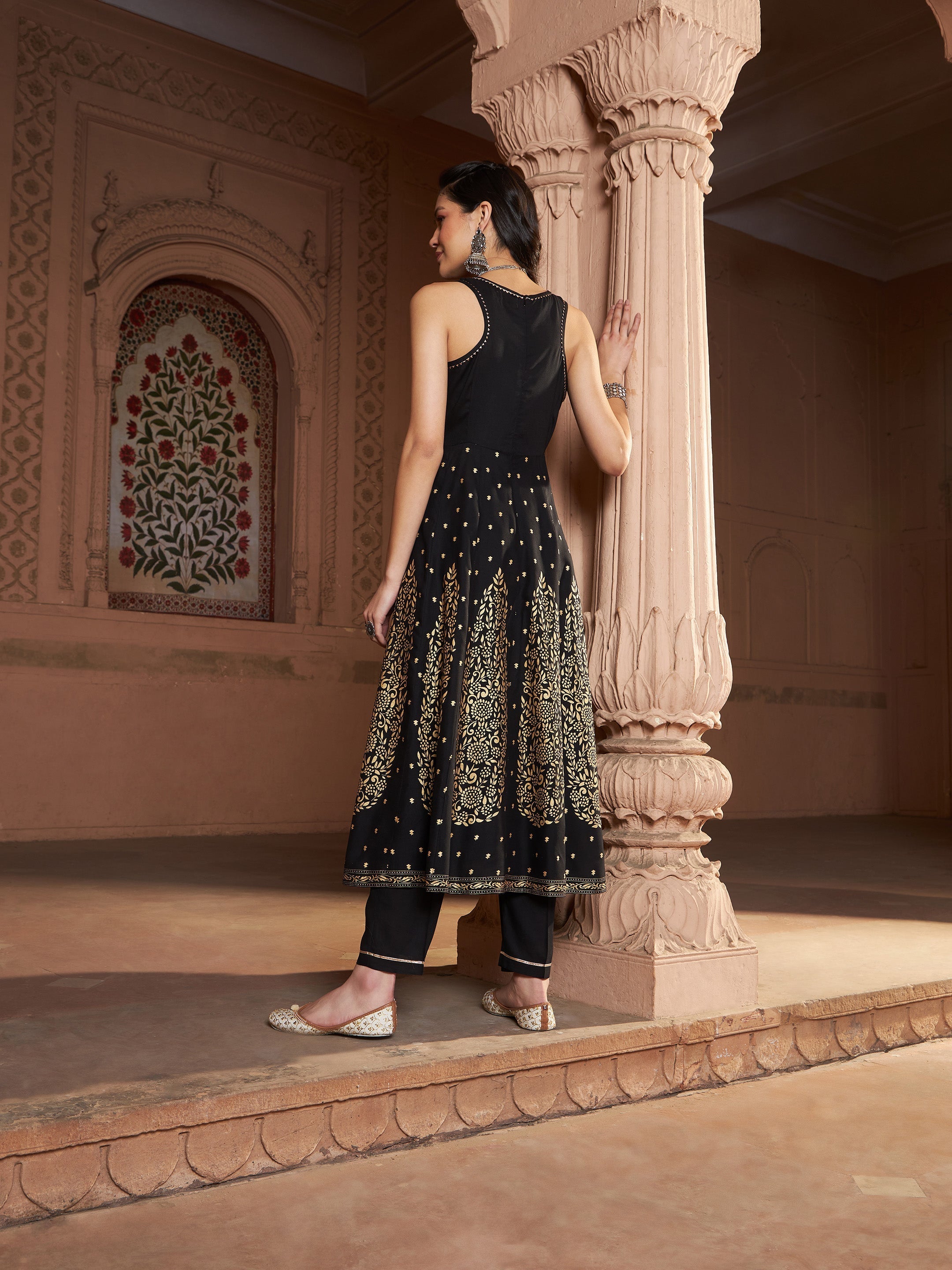 Black Kali Foil Sleeveless Anarkali Kurta With Pants, in Rayon fabric, Unlined, Calf Length /Ankle Length, Fit & Flare / Tapered Fit, Zipper Closure / Elasticated Waistband, Flared / Straight Hemline and features Box Back Detail At Back