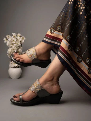 These are One Toe Kolhapuri Wedges. Modern and fresh for the go getter inside of you. This could be a statement piece in your outfit for the uniqueness it brings to your overall look. Made for utmost comfort, You can throw them on for a casual brunch date, a walk on the beach and see how they effortlessly transition to an office dinner party fit.