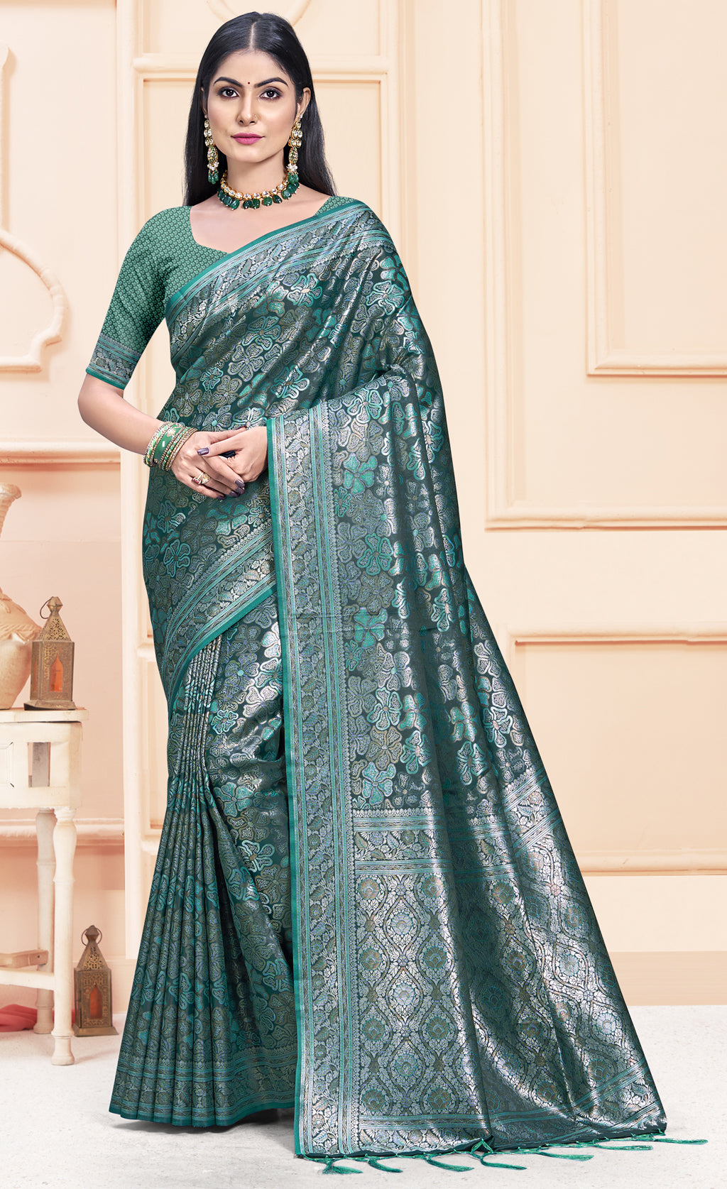 This Green Color Asha (satan) Saree Is Crafted Beautifully By Us On Satin Fabric. This Saree Is Perfect For Traditional And Festival Wear As It Has Beautiful Woven Work On It.