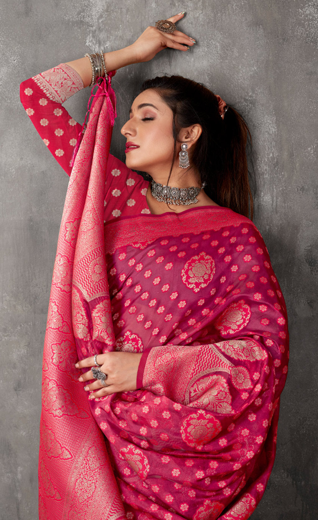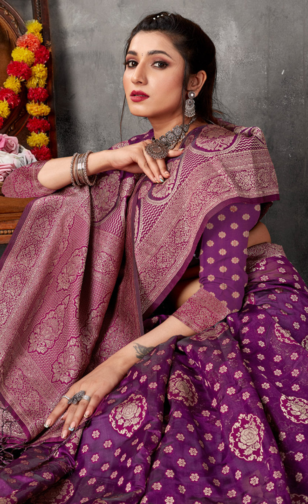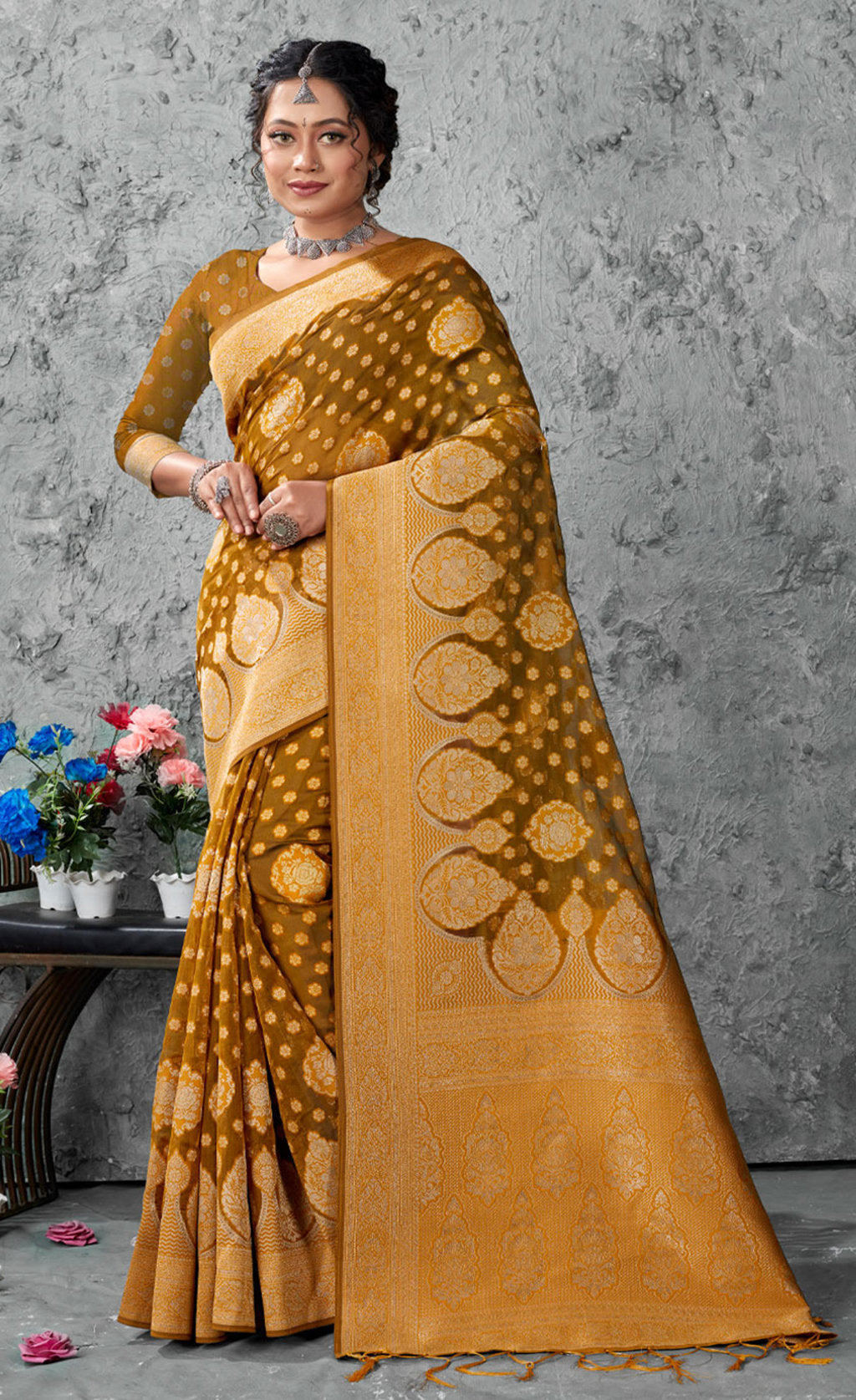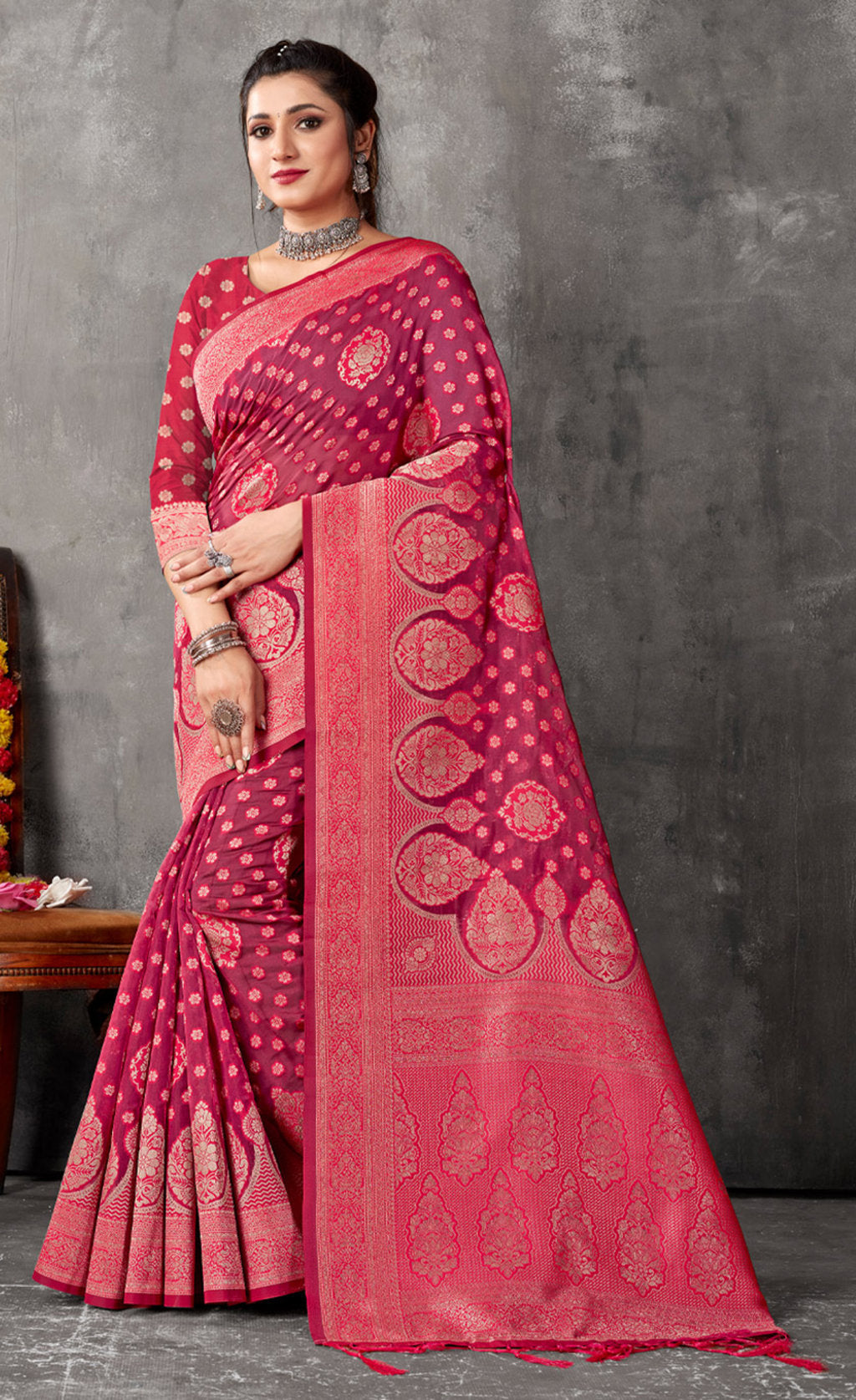 This Red color MADHUMATI Saree is crafted beautifully by us on Organza fabric. This Saree is perfect for Traditional and Festive wear as it has beautiful Woven Zari Work on it.