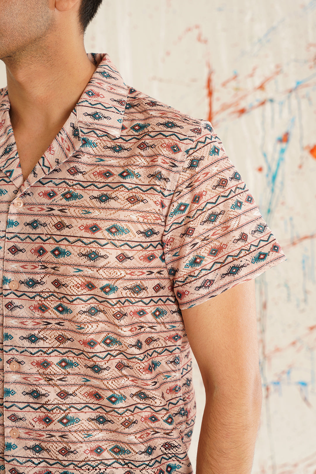 Classic Peach Printed Spread Collar Short Sleeves Cotton Casual Shirt