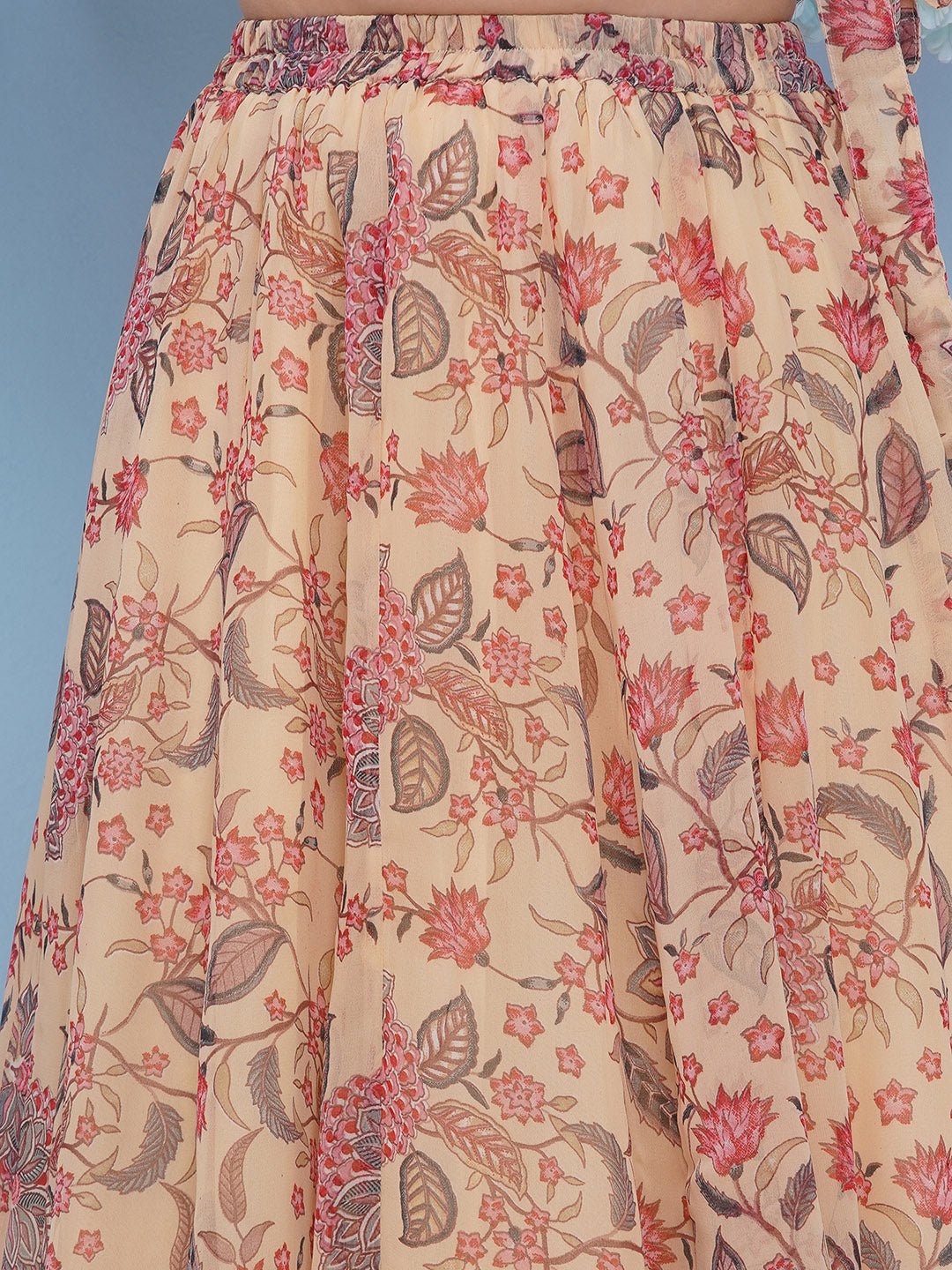 Beige & Red Georgette Flower Printeded Choli V-Neck has a Three-Quarter Sleeves Lace Work Choli, Beige & Printeded Lehenga