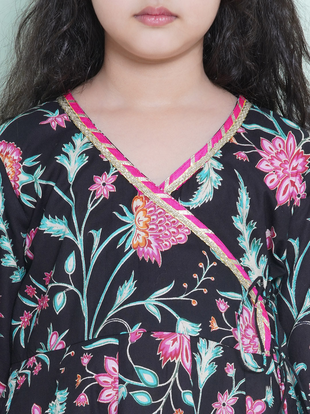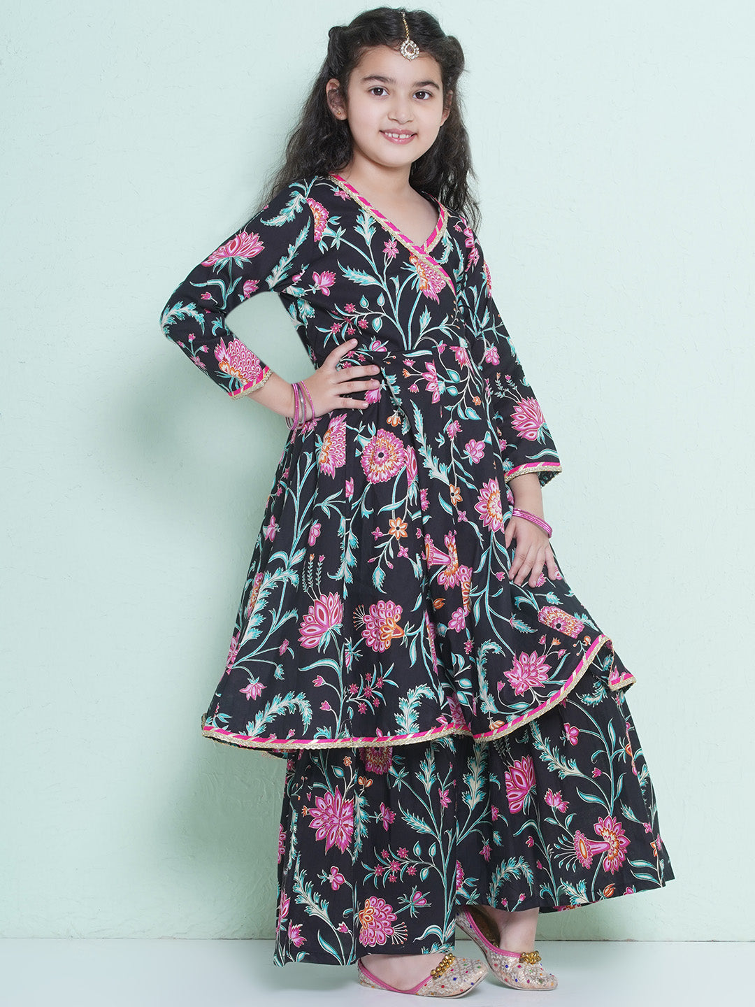 Black Floral printed Angrakha style Kurta has a V-neck, three-quarter regular sleeves Calf length with flared hem with Elasticated waistband Sharara
