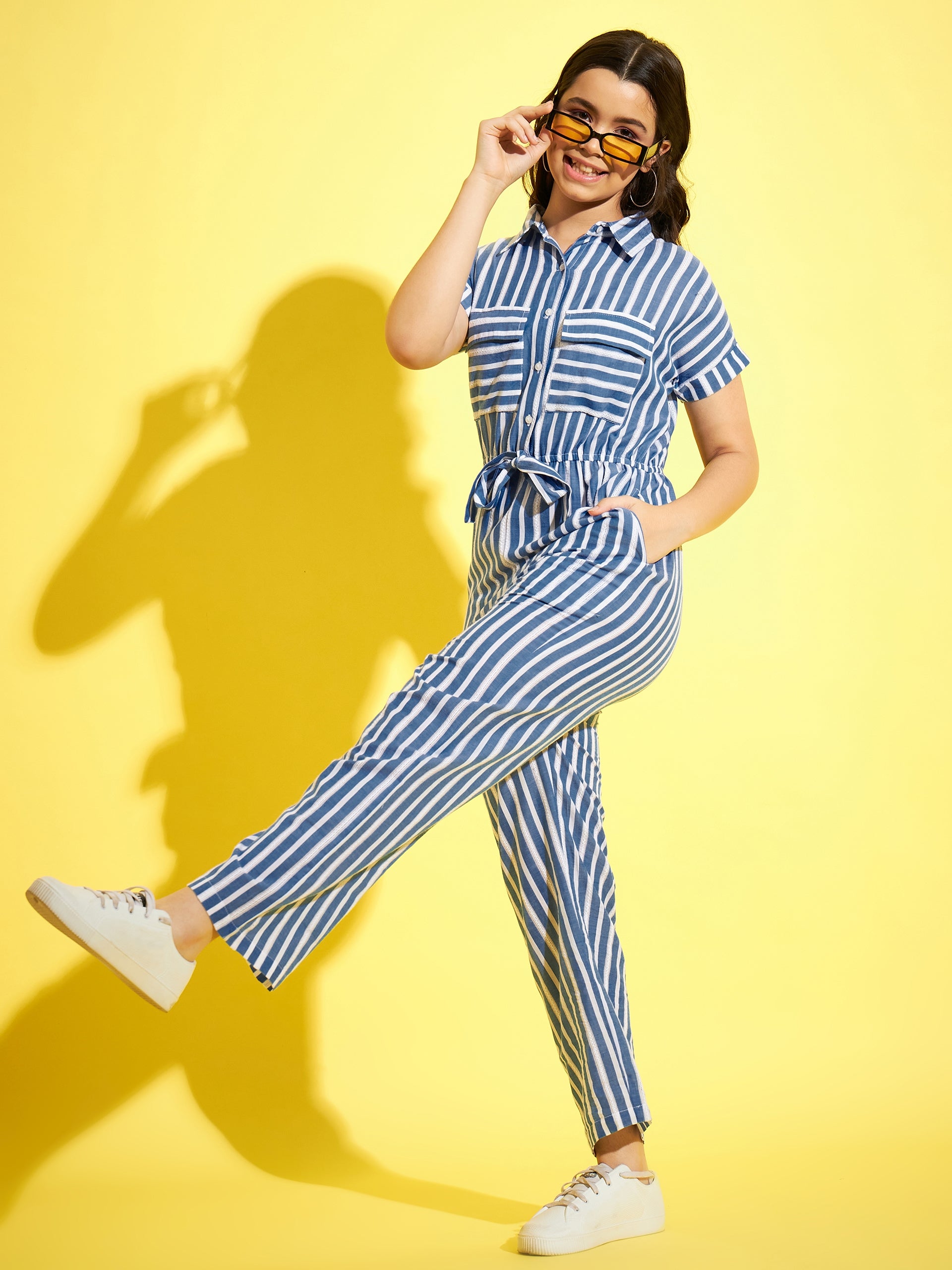 Girls Blue & White Cotton Striped Jumpsuit