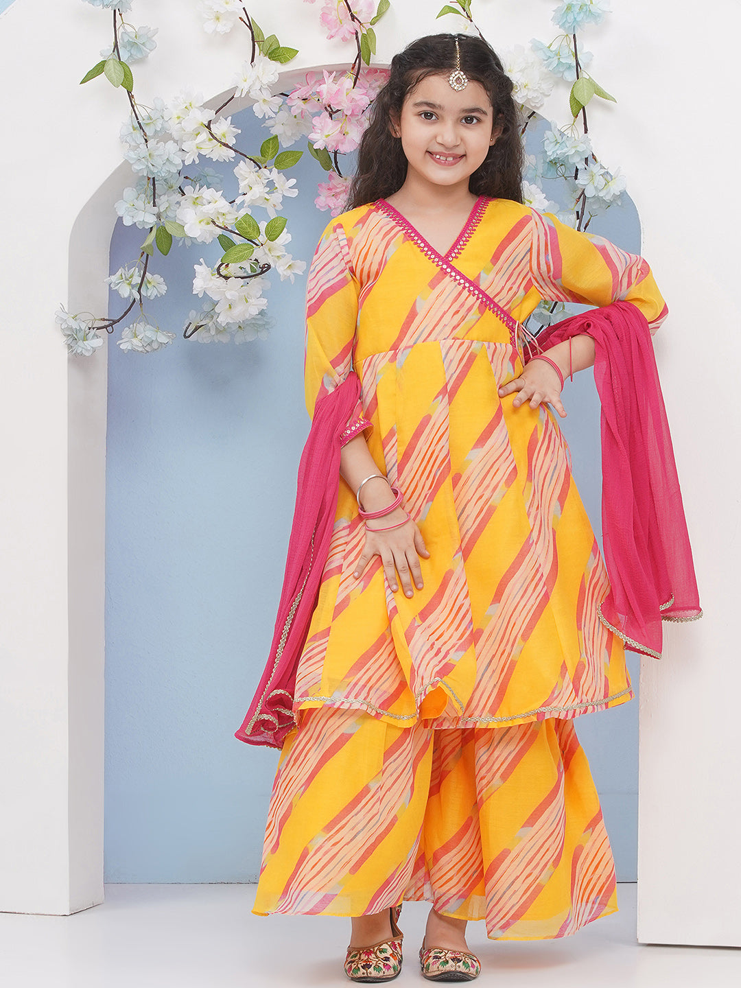 Yellow Leheriya printed Angrakha style Kurta has a V-neck, three-quarter regular sleeves Calf length with flared hem with Elasticated waistband Sharara with dupatta