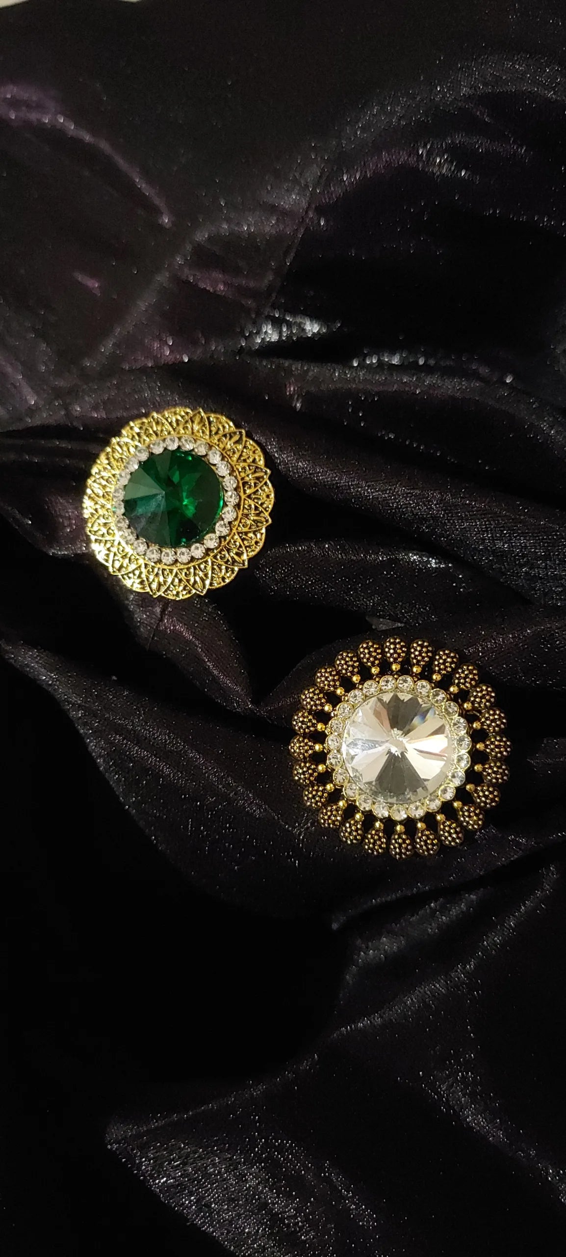 Golden-Toned Green - Pink stone-studded adjustable finger rings combo