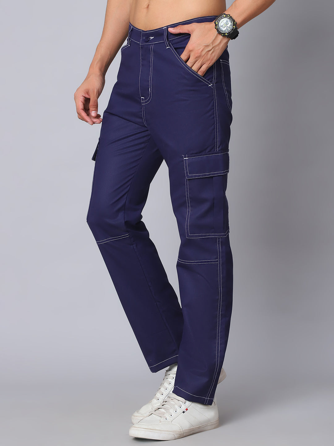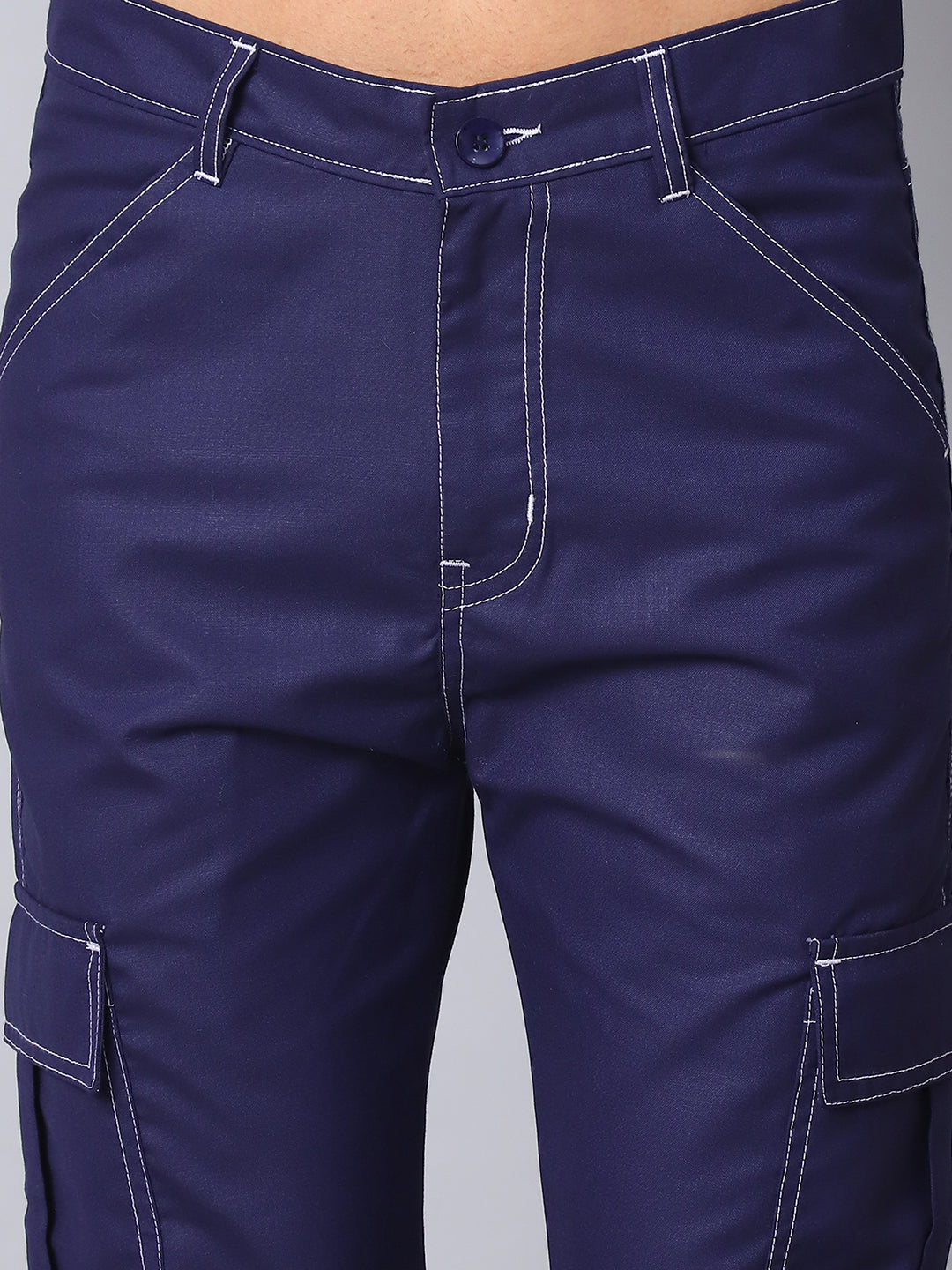 Navy Cotton Blend Solid Straight Fit Cargo Pants, has a button closure, Seven pockets