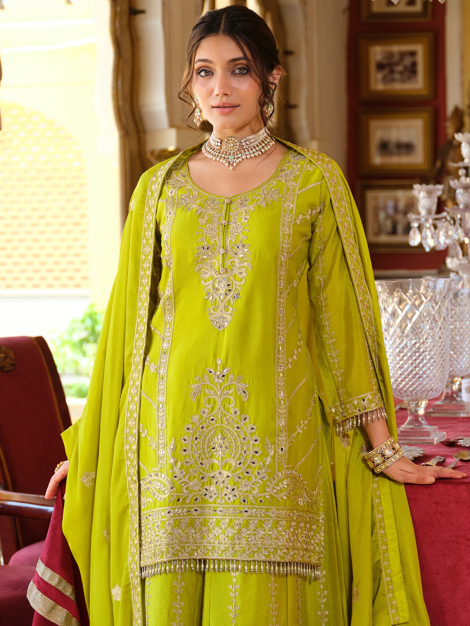 Green Embroidered Straight Kurta Palazzos With Dupatta set