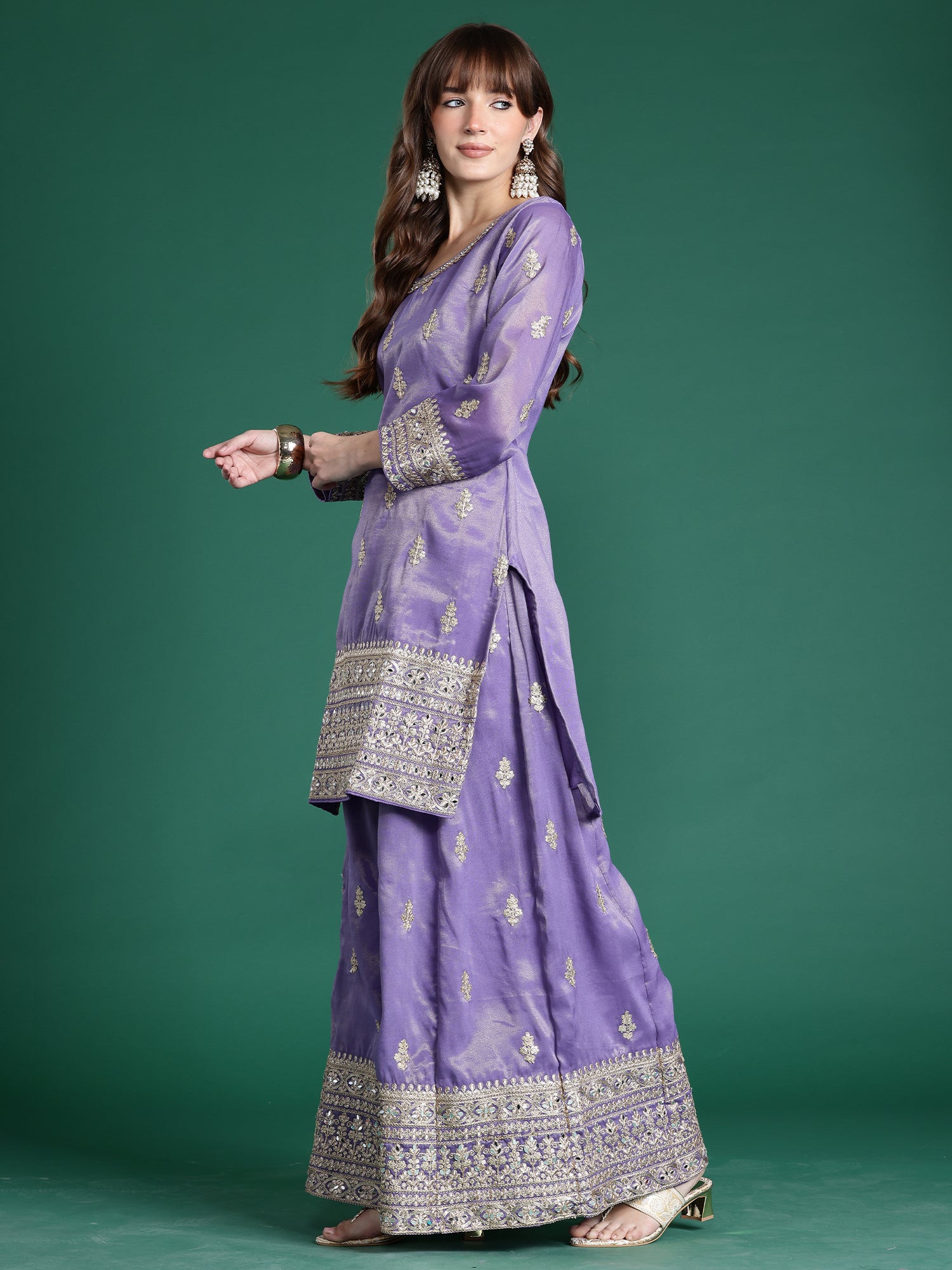 Length of Kurta: Above Knee|Shape: Straight|Fabric: Silk Blend|Colour: Lavender|Work/Pattern: Embroidered|Neck Line: Round Neck|Length: Above Knee|Style: Palazzos|Fabric: Silk Blend|Closure: Slip-On