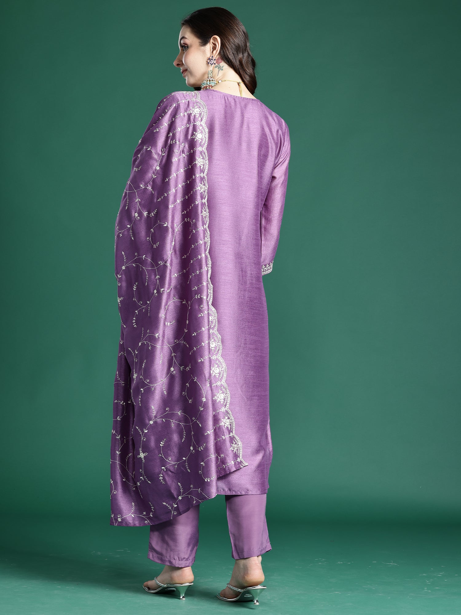 Length of Kurta: Calf Length|Shape: Straight|Fabric: Silk Blend|Colour: Lavender|Work/Pattern: Embroidered|Neck Line: Round Neck|Length: Calf Length|Style: Trousers|Fabric: Shantoon|Closure: Slip-On