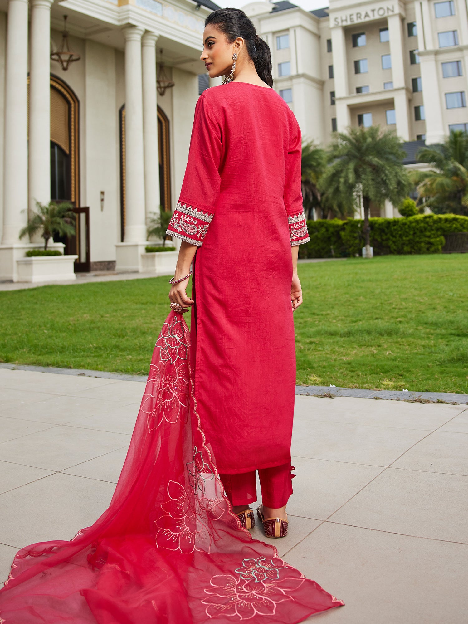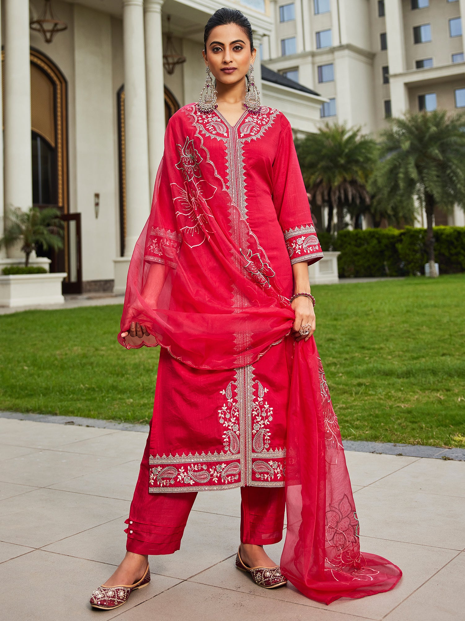 Length of Kurta: Calf Length|Shape: Straight|Fabric: Silk Blend|Colour: Pink|Work/Pattern: Embroidered|Neck Line: V-Neck|Length: Calf Length|Style: Trousers|Fabric: Silk Blend|Closure: Slip-On