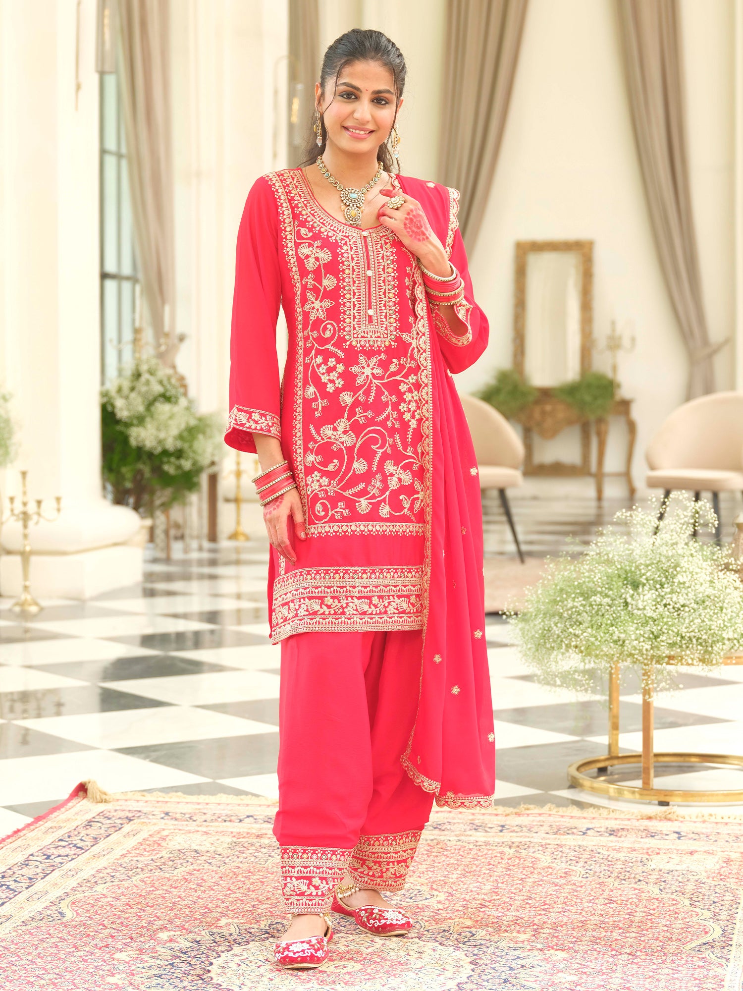 Length of Kurta: Above Knee | Shape: Straight | Work/Pattern: Embroidered | Neck Line: Round Neck | Length: Above Knee | Style(Pants, Flared, Palazzo):Patiala | Closure:Slip-On