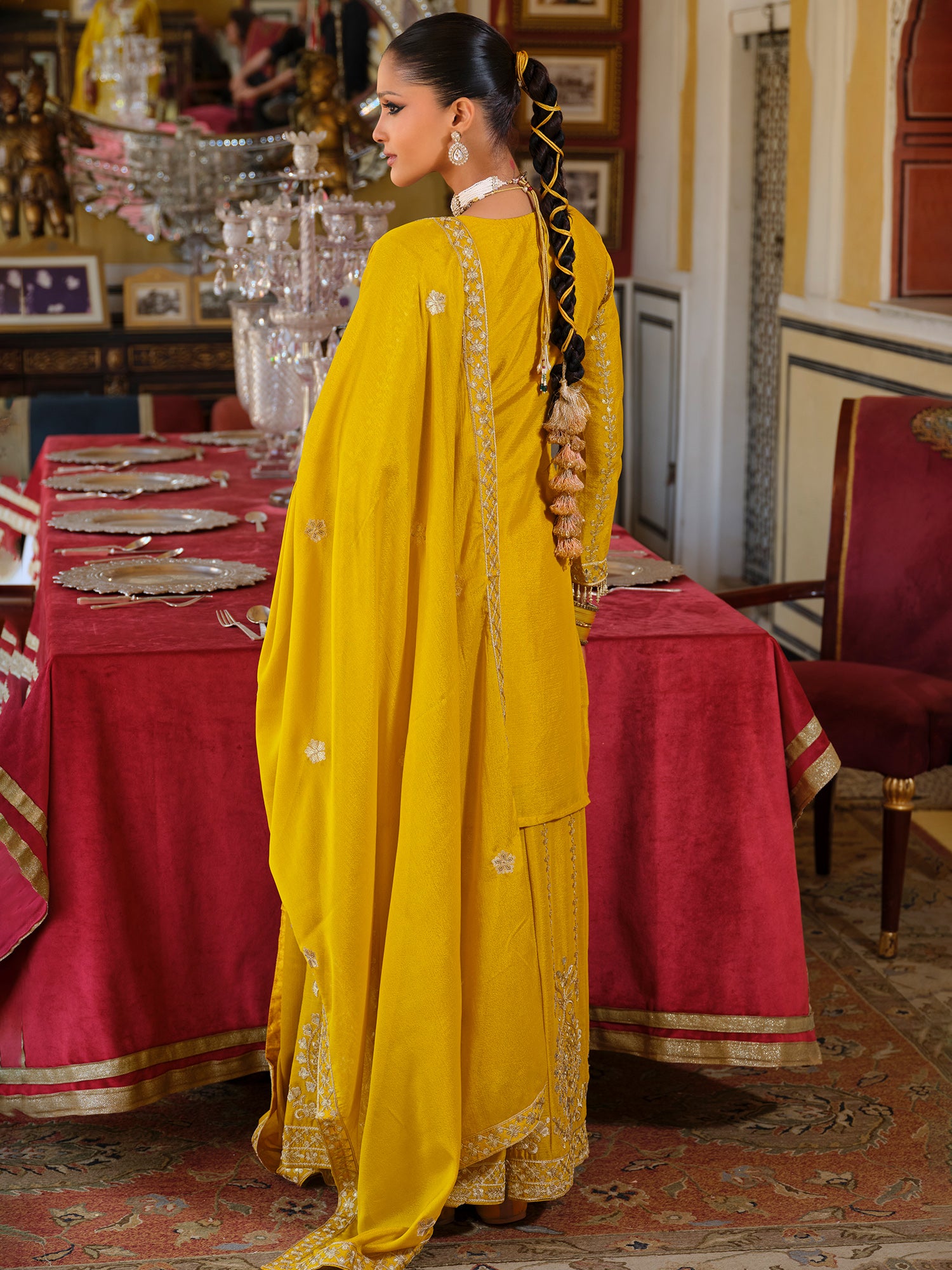Length of Kurta: Above Knee|Shape: Straight|Fabric: Chinon|Colour: Yellow|Work/Pattern: Embroidered|Neck Line: Round Neck|Length: Above Knee|Style: Palazzos|Fabric: Chinon|Closure: Slip-On
