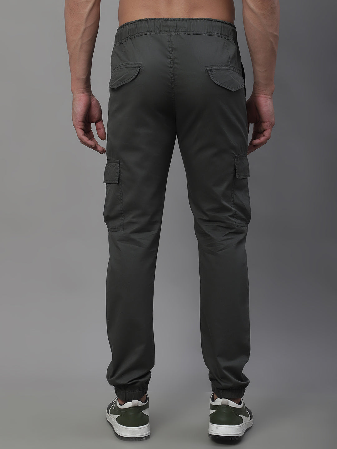 Grey Cotton Solid Tapered Fit Cargo Pants, has a button closure, Seven pockets