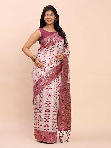 Step into elegance with this off-white and Maroon linen cotton saree, designed with charming Maroon woven motifs and a shimmering zari pallu. Light, breathable, and graceful – this saree is ideal for daily sophistication or festive flair.