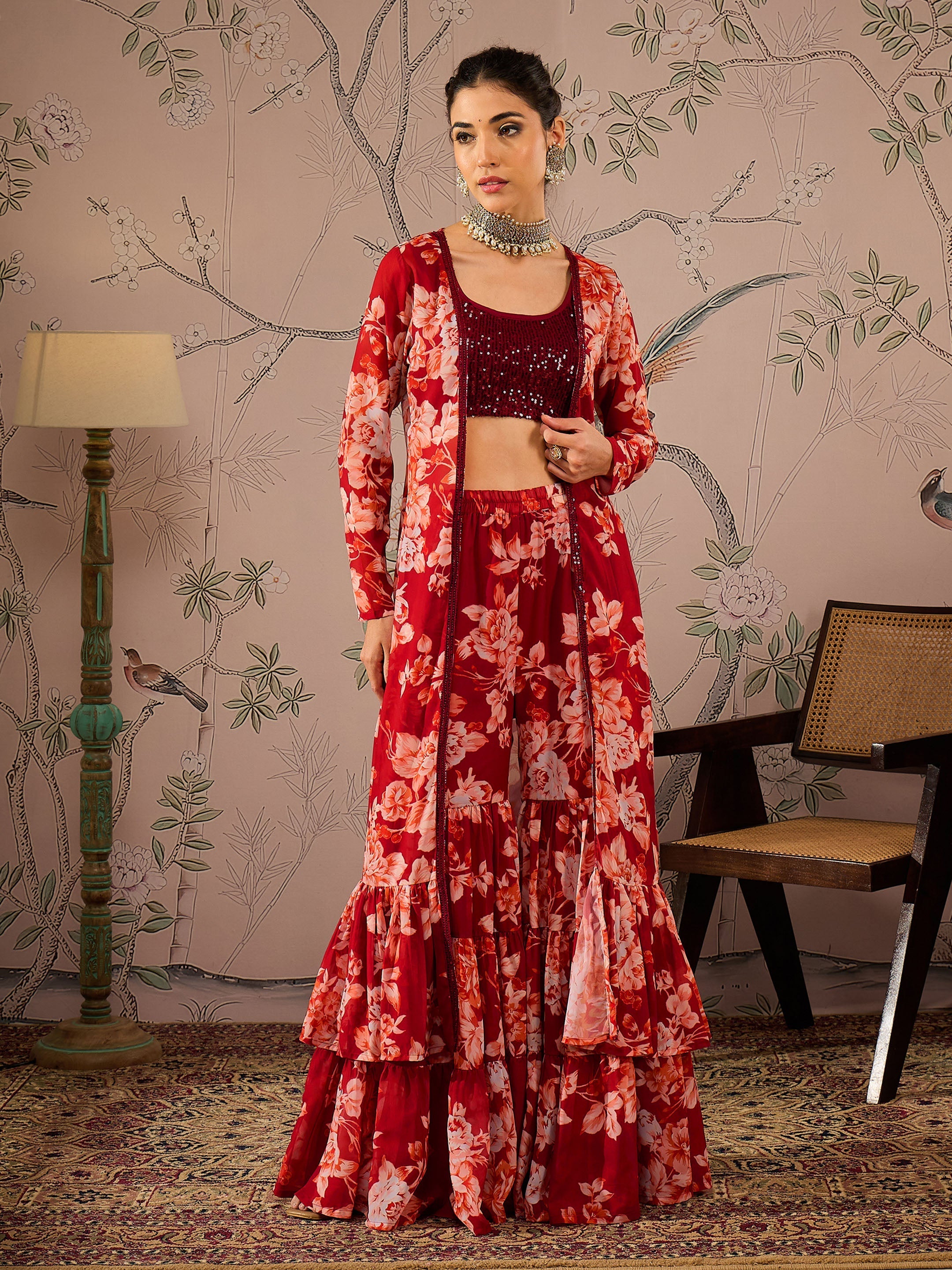 Maroon Sequins Crop Top With Floral Sharara And Shrug, in Sequence fabric, Butter Crepe Lining , Crop Length, Comfort Fit, Drawstring Closure, Straight Hemline and features Dori Detail At Back