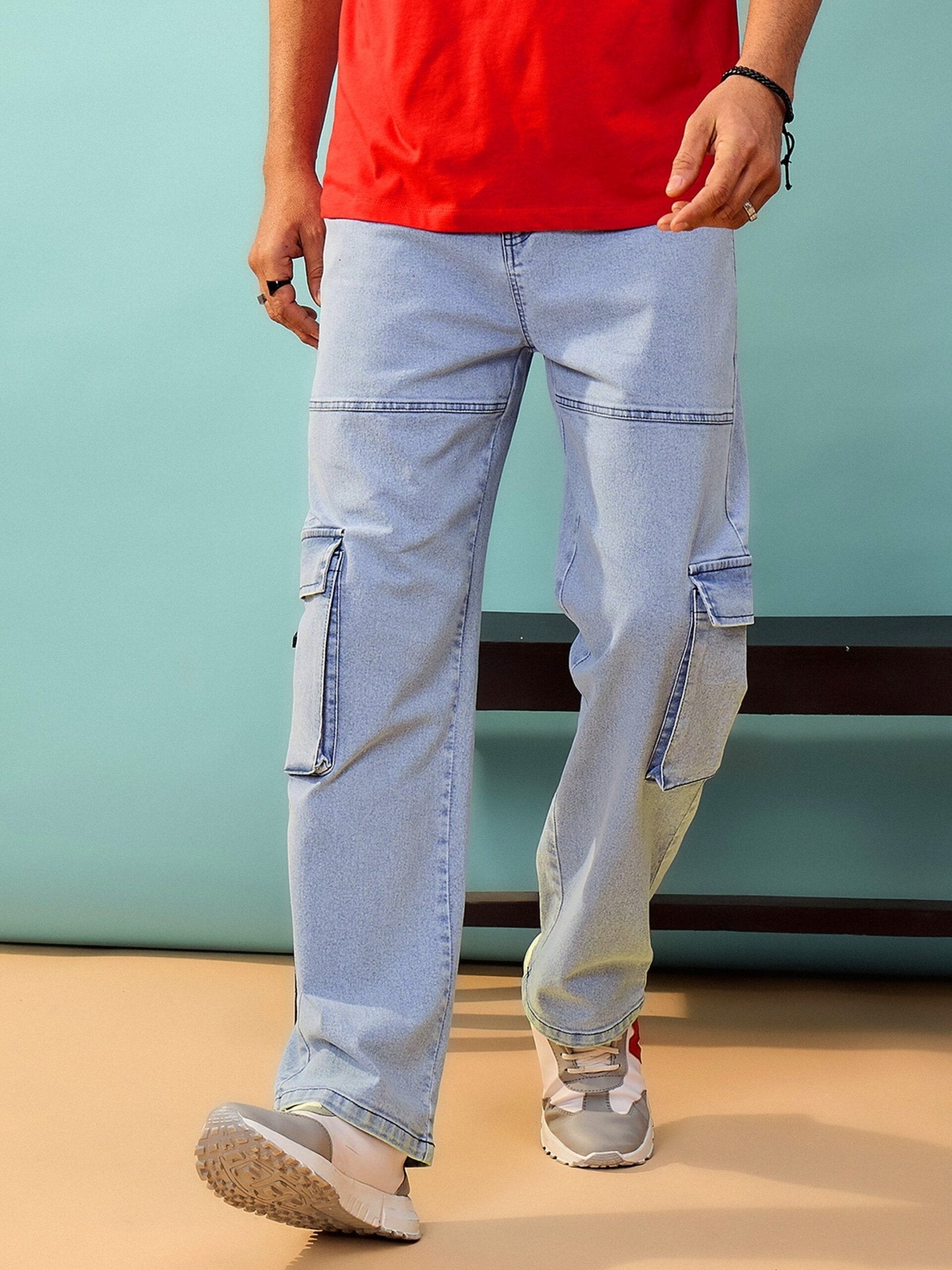 Blue Washed Cargo Pocket Oversize Jeans, in Denim fabric, Unlined, Full Length, Oversize Fit, Button Closure, Straight Hemline and features Flap Pocket At Side | Model Info: Model is wearing size M (32). Model Waist - 32" , Hips - 40", Height - 6' | Specifications: