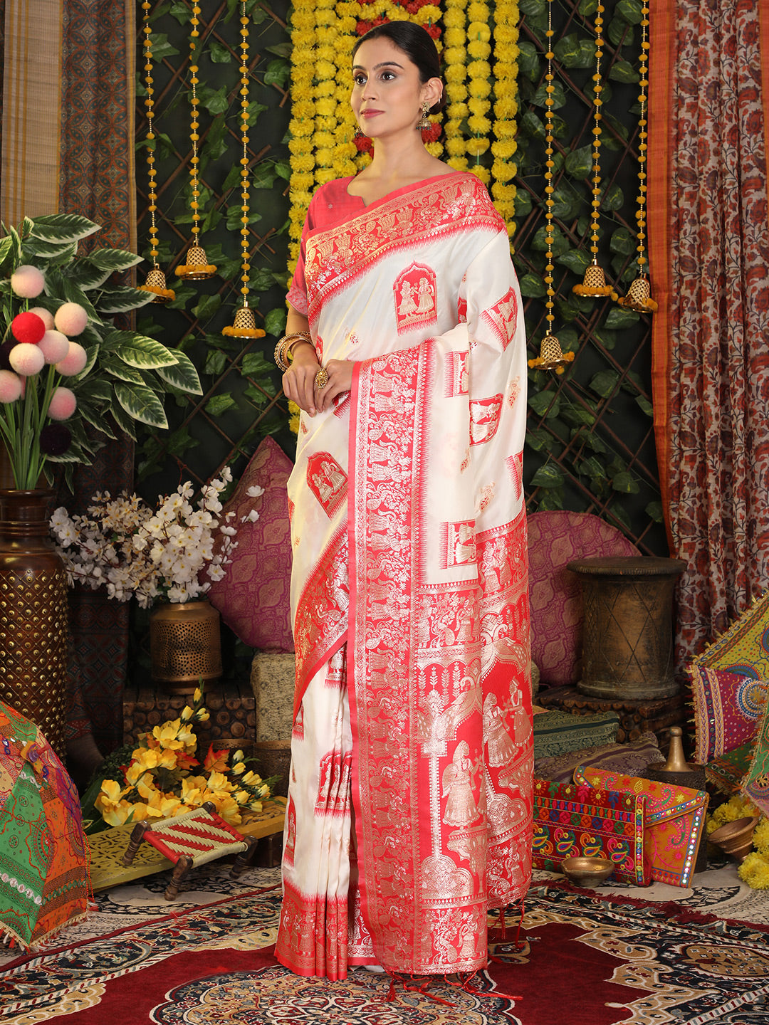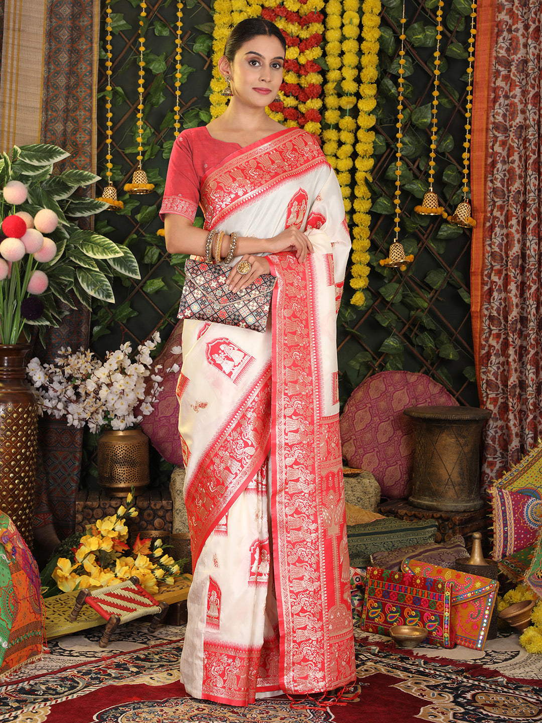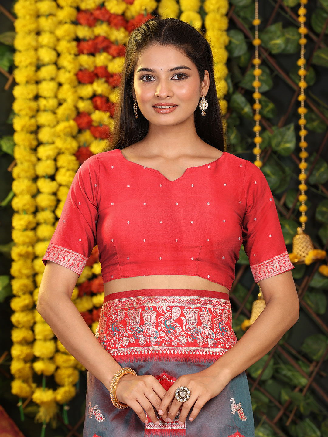 Elevate your ethnic charm in this red art silk saree featuring temple-inspired motifs and a rich pallu. Perfect for weddings, festivals, and cultural occasions. A blend of tradition and elegance.