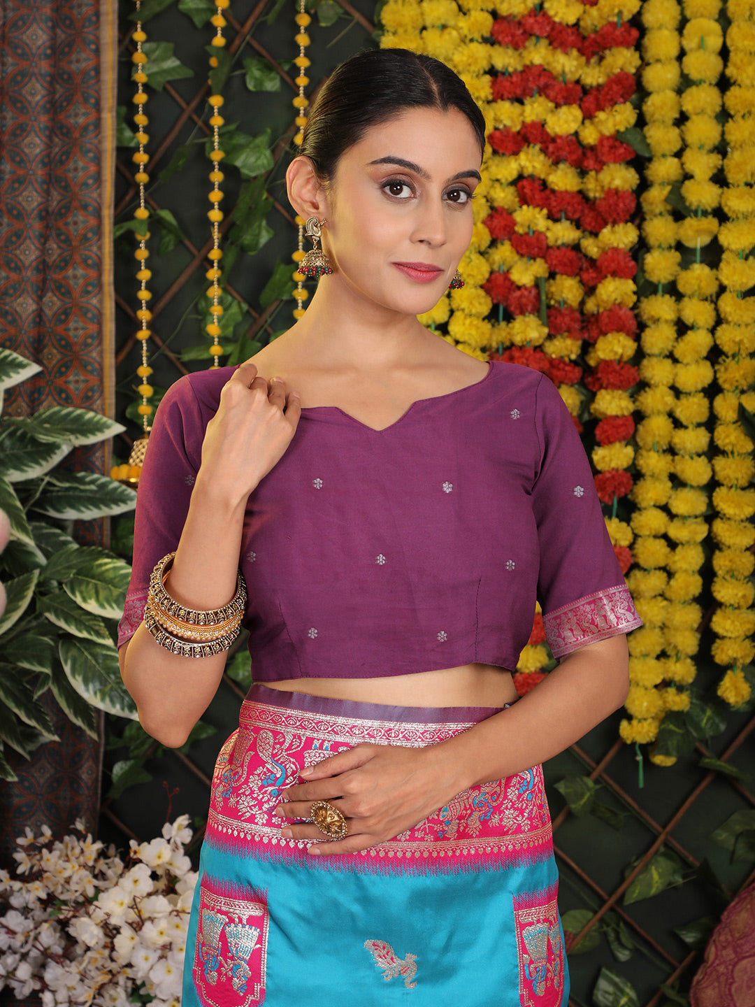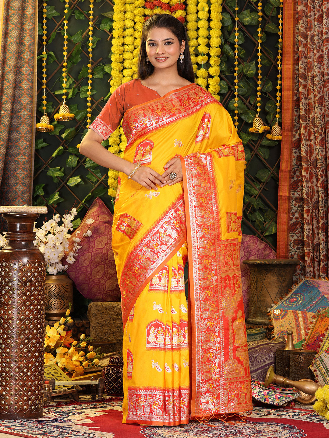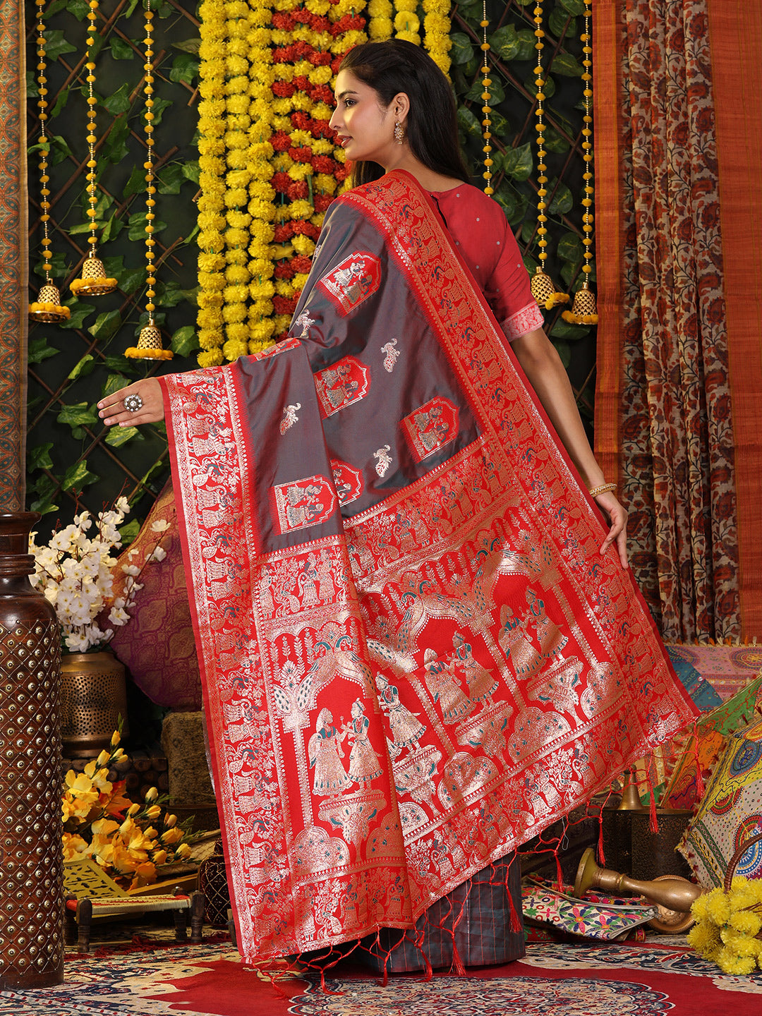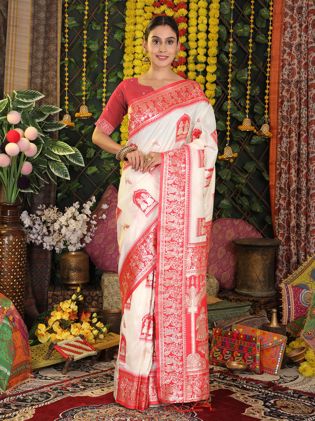Elevate your ethnic charm in this red art silk saree featuring temple-inspired motifs and a rich pallu. Perfect for weddings, festivals, and cultural occasions. A blend of tradition and elegance.