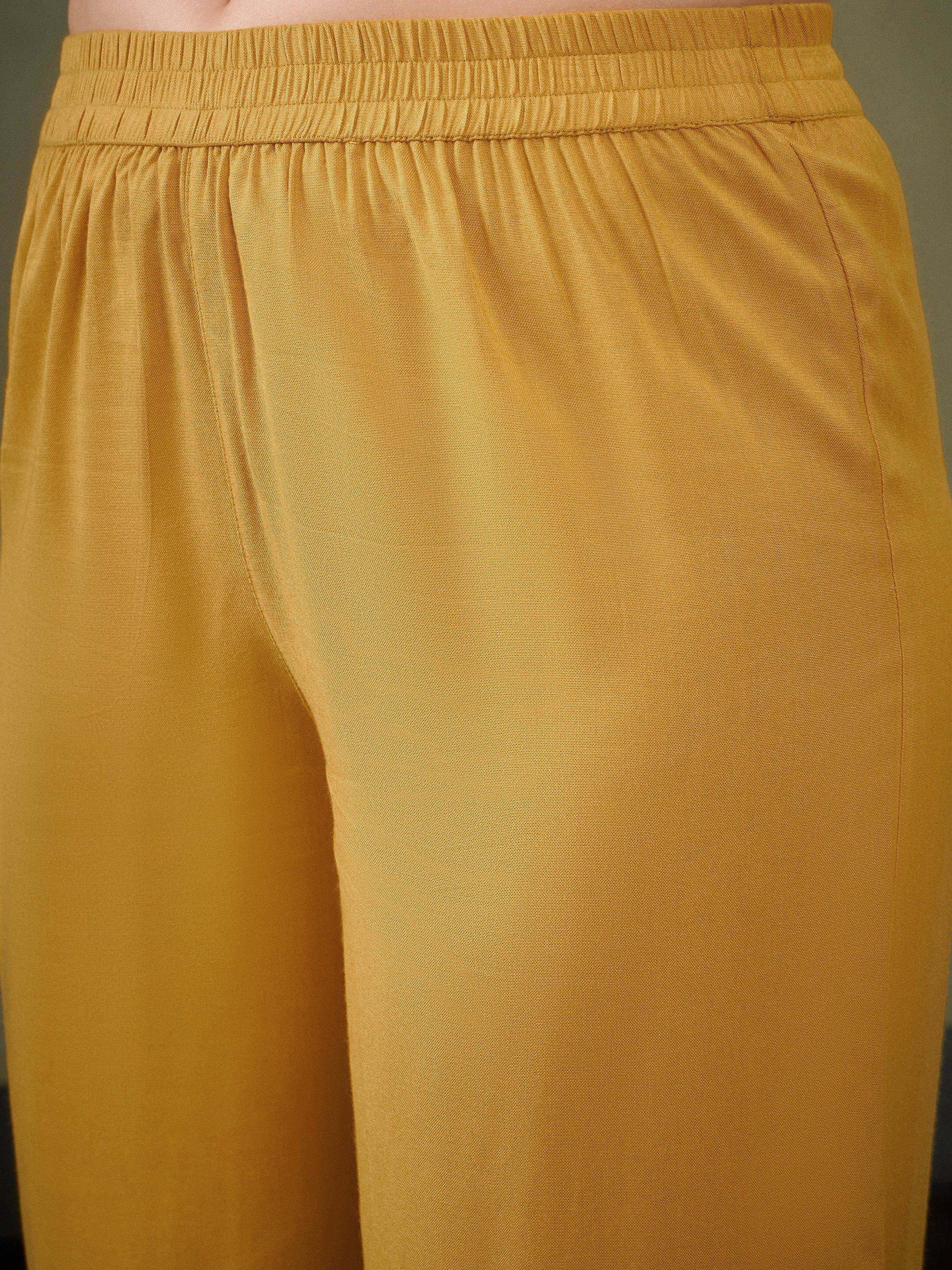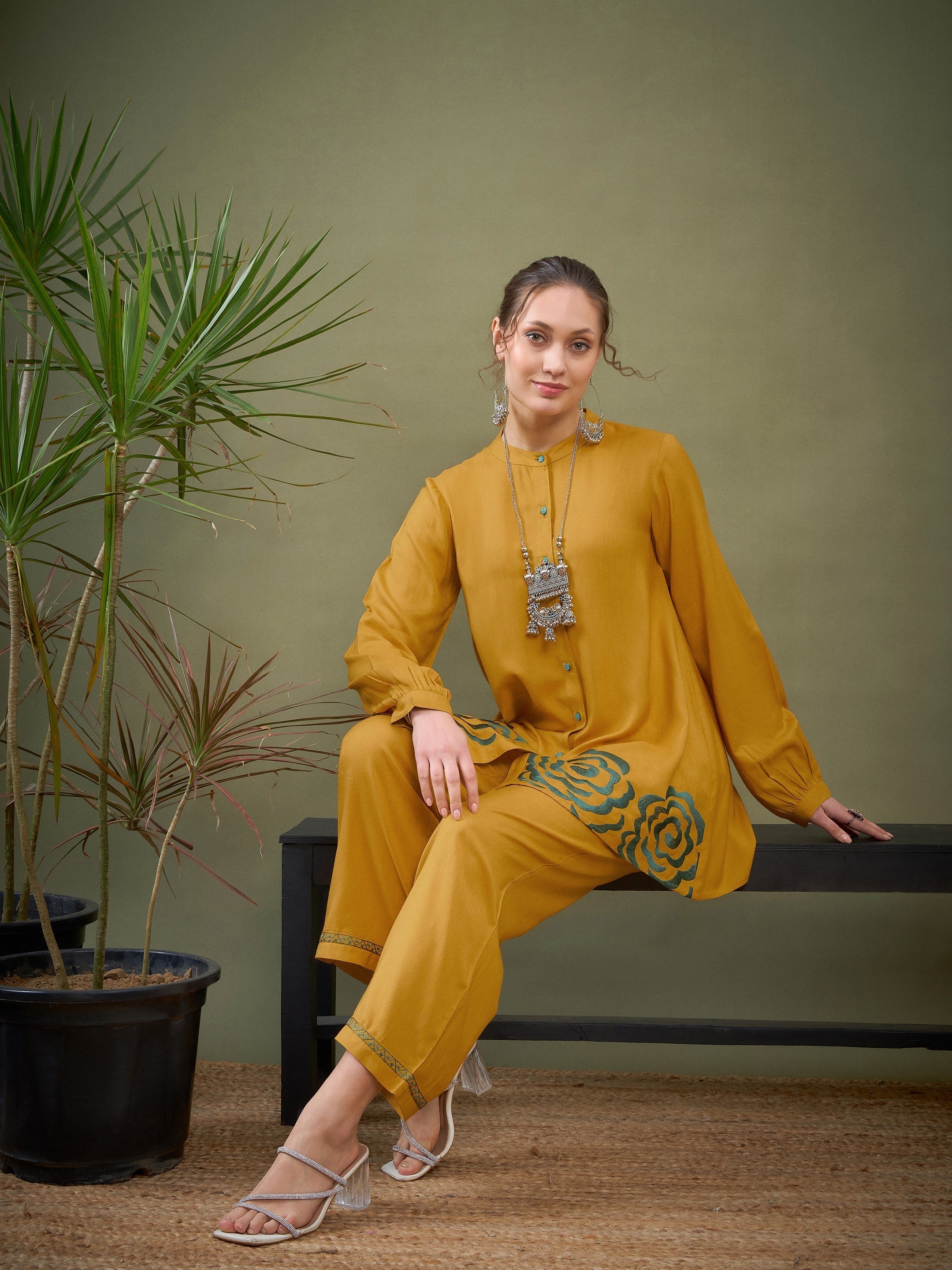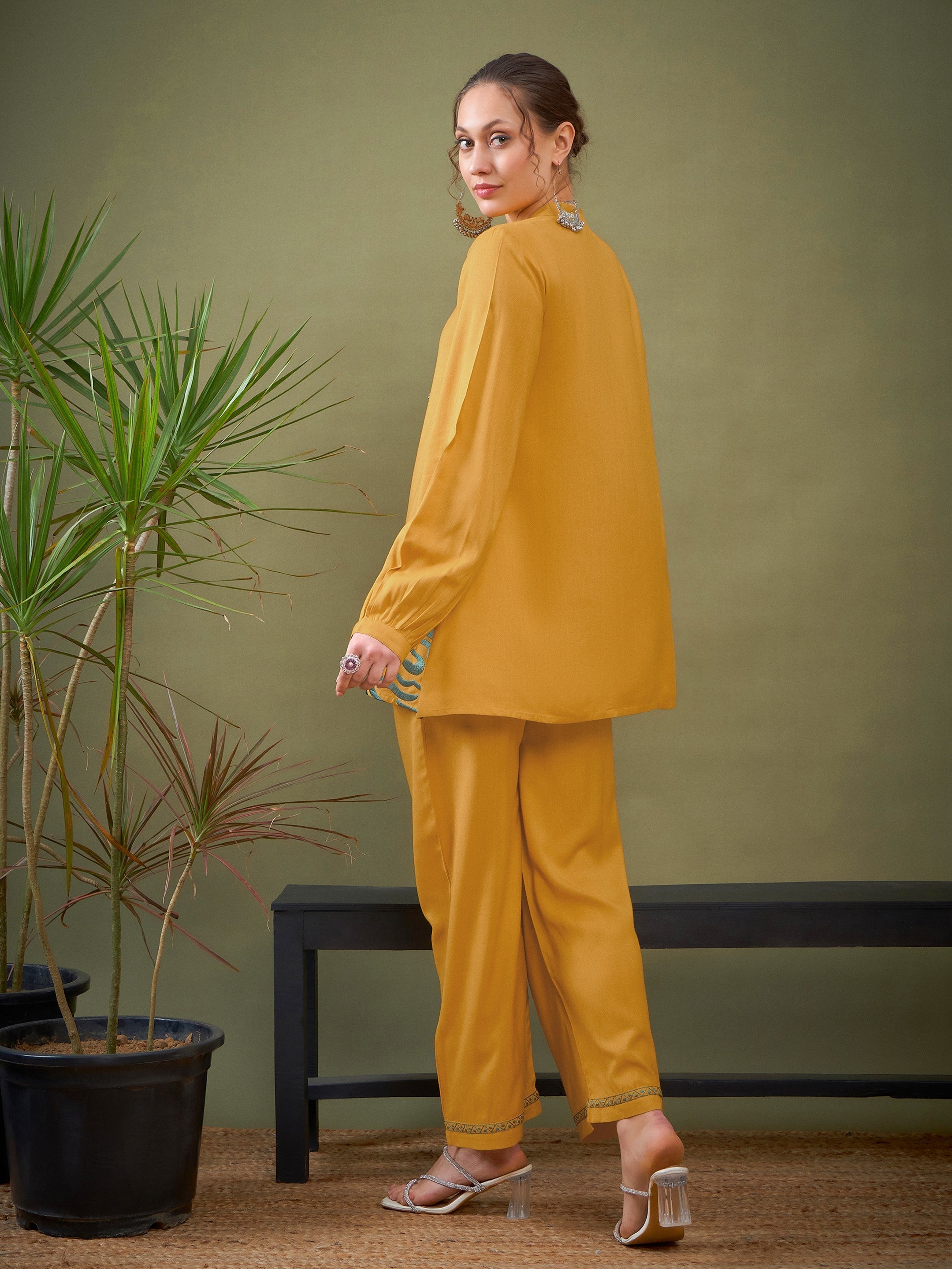 Mustard Hem Embroidered Shirt With Palazzos, in Rayon fabric, Unlined, Regular Length, Comfort Fit, Button Closure, Straight Hemline and features Embroidery Detail At Hem
