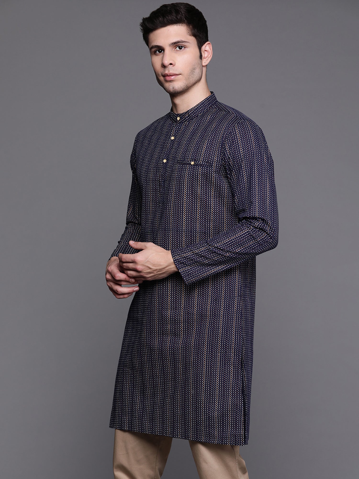 Indo Era Navy Blue Herringbone Cotton Straight Kurtas