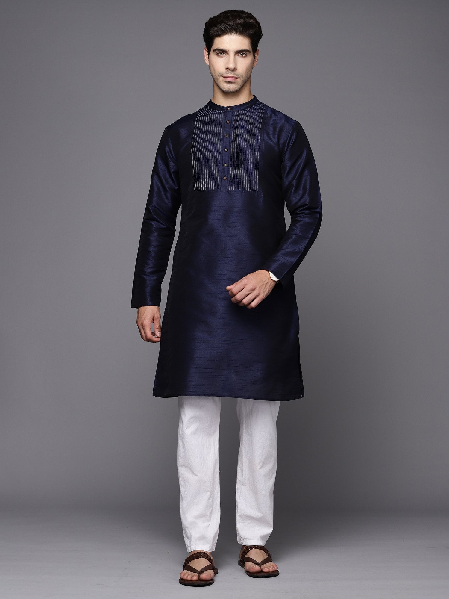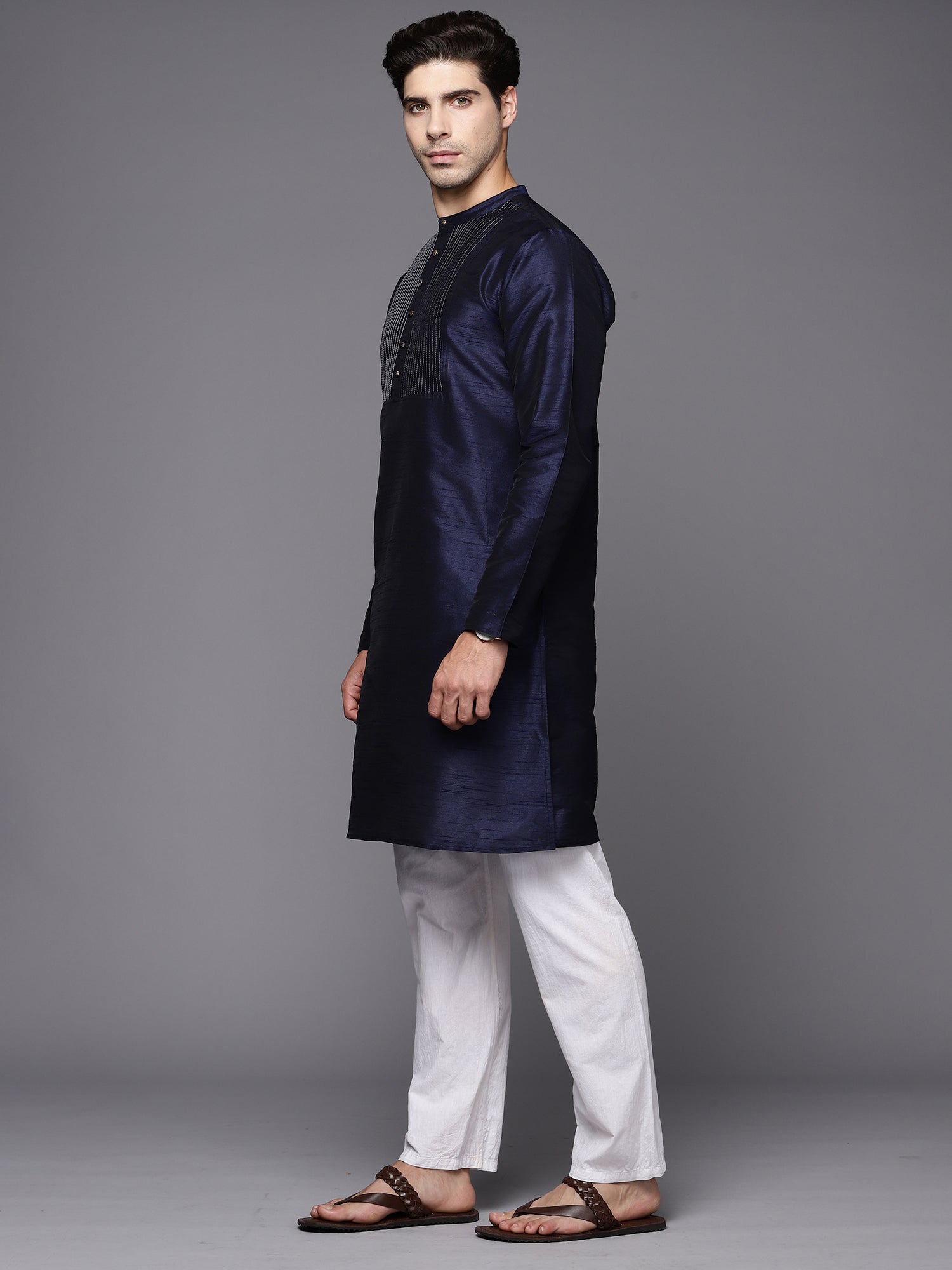 Indo Era Navy Blue Solid Silk Blend Straight Kurtas