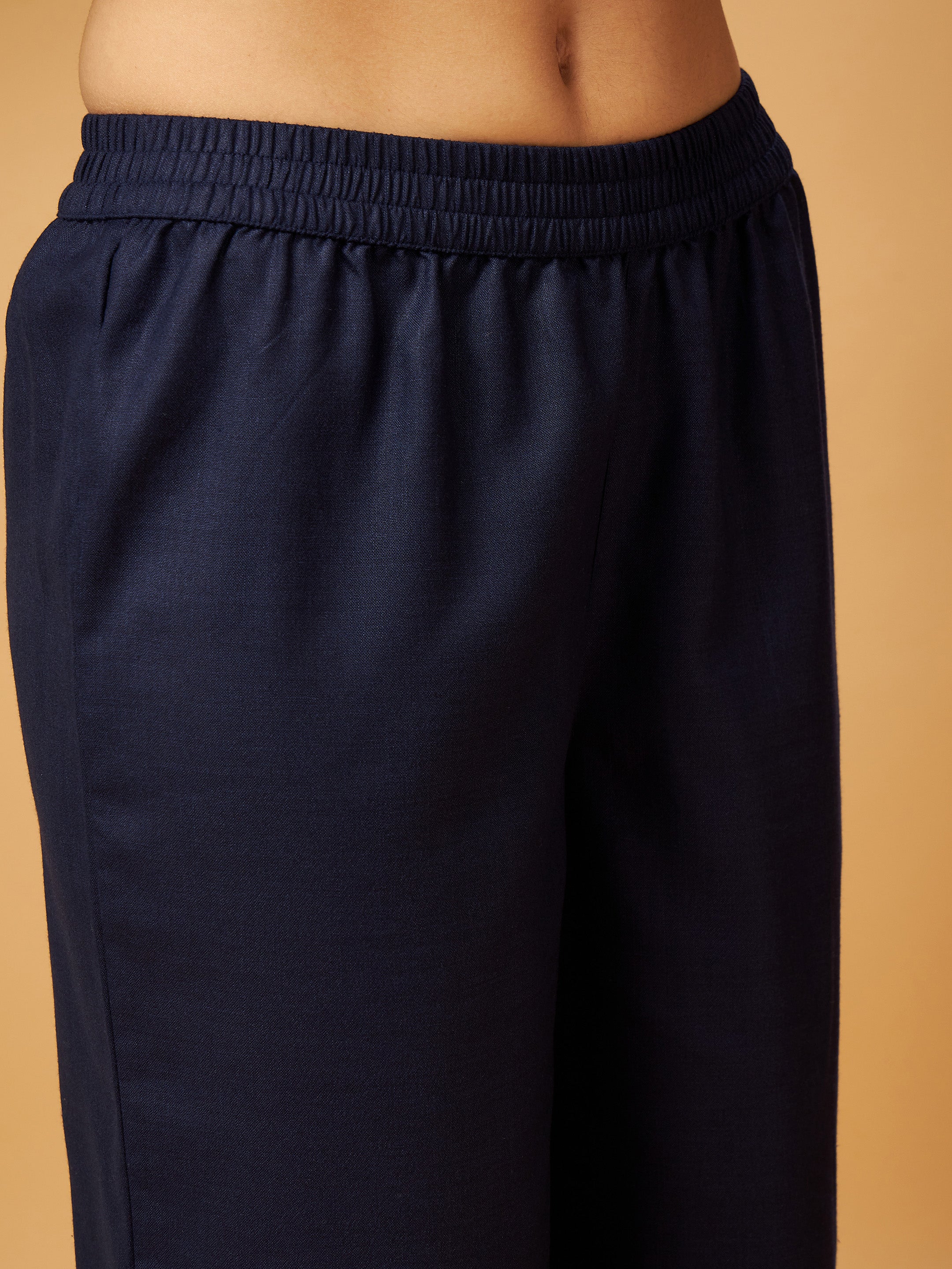 Indulge in elegance with our Navy Zari Embroidered Shawl Collar Top With Palazzos. Made from Poly Viscose fabric, this ensemble features a comfortable fit, button closure, and straight hemline. The exquisite Zari Embroidery at the shawl collar and sleeve opening adds a regal charm.