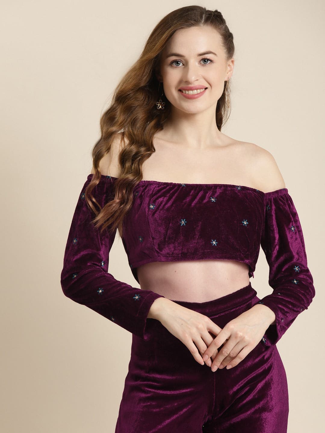 Purple Off Shoulder Velvet Embroidered Crop Top, in Velvet fabric, Cotton Lining, Crop Length, Slim Fit, Zipper Closure, Straight Hemline and features All Over Floral Zari Embroidery