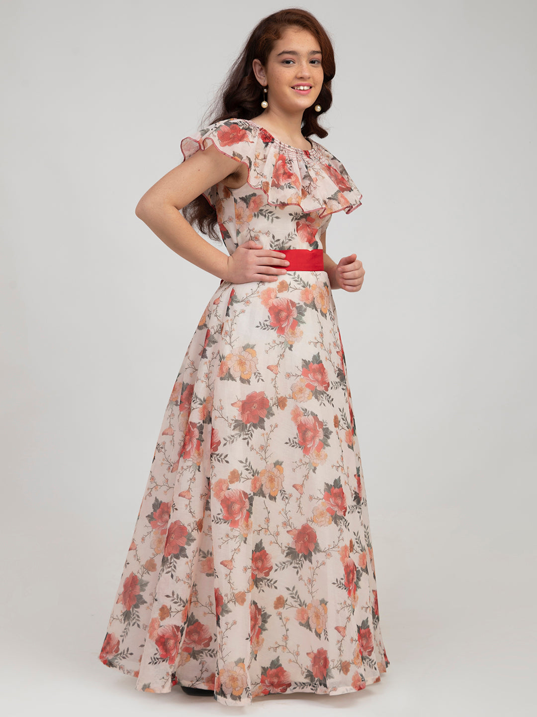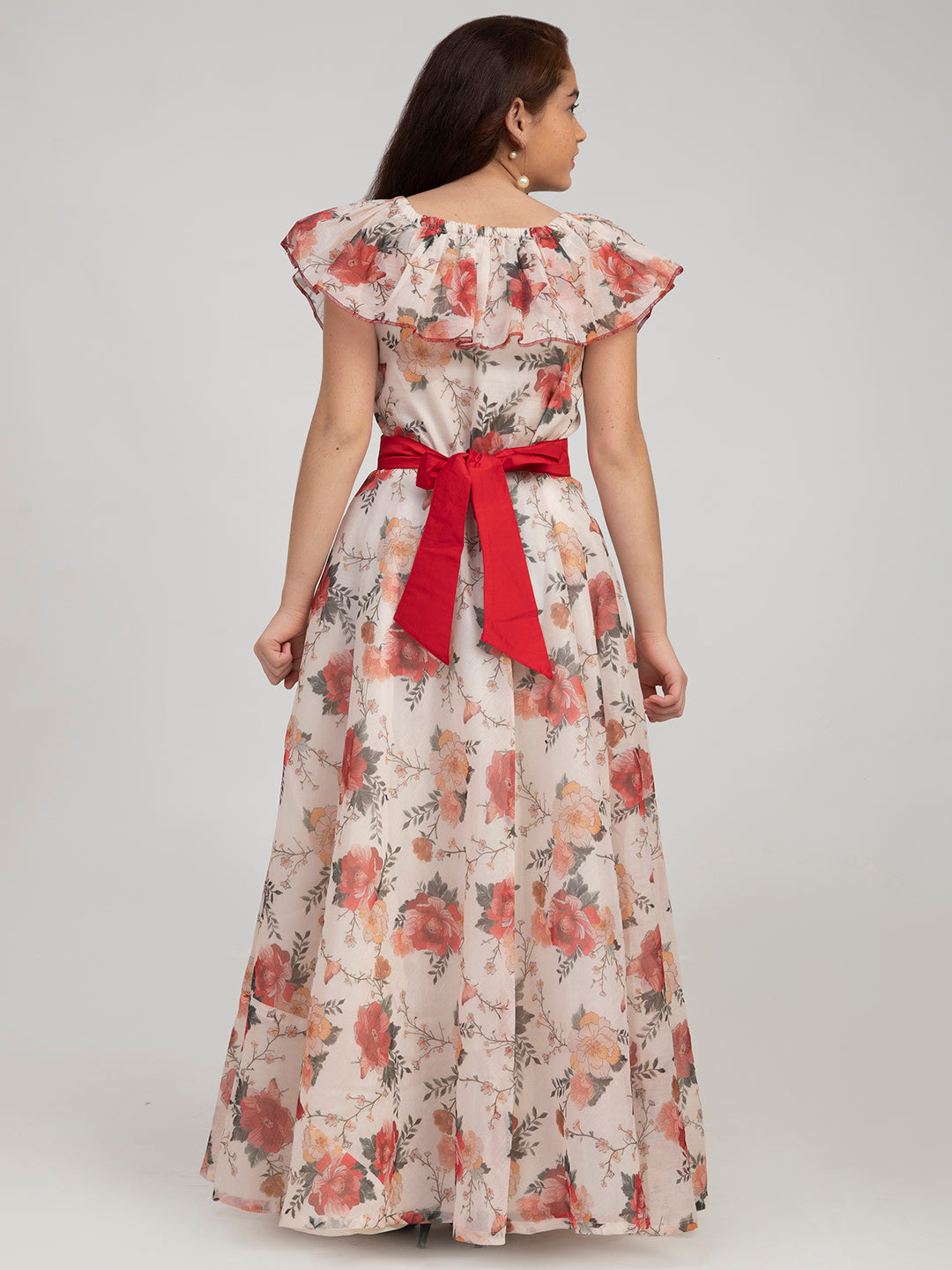 Silk Woven Half Sleeves Flower Print Flared Frock - Beige