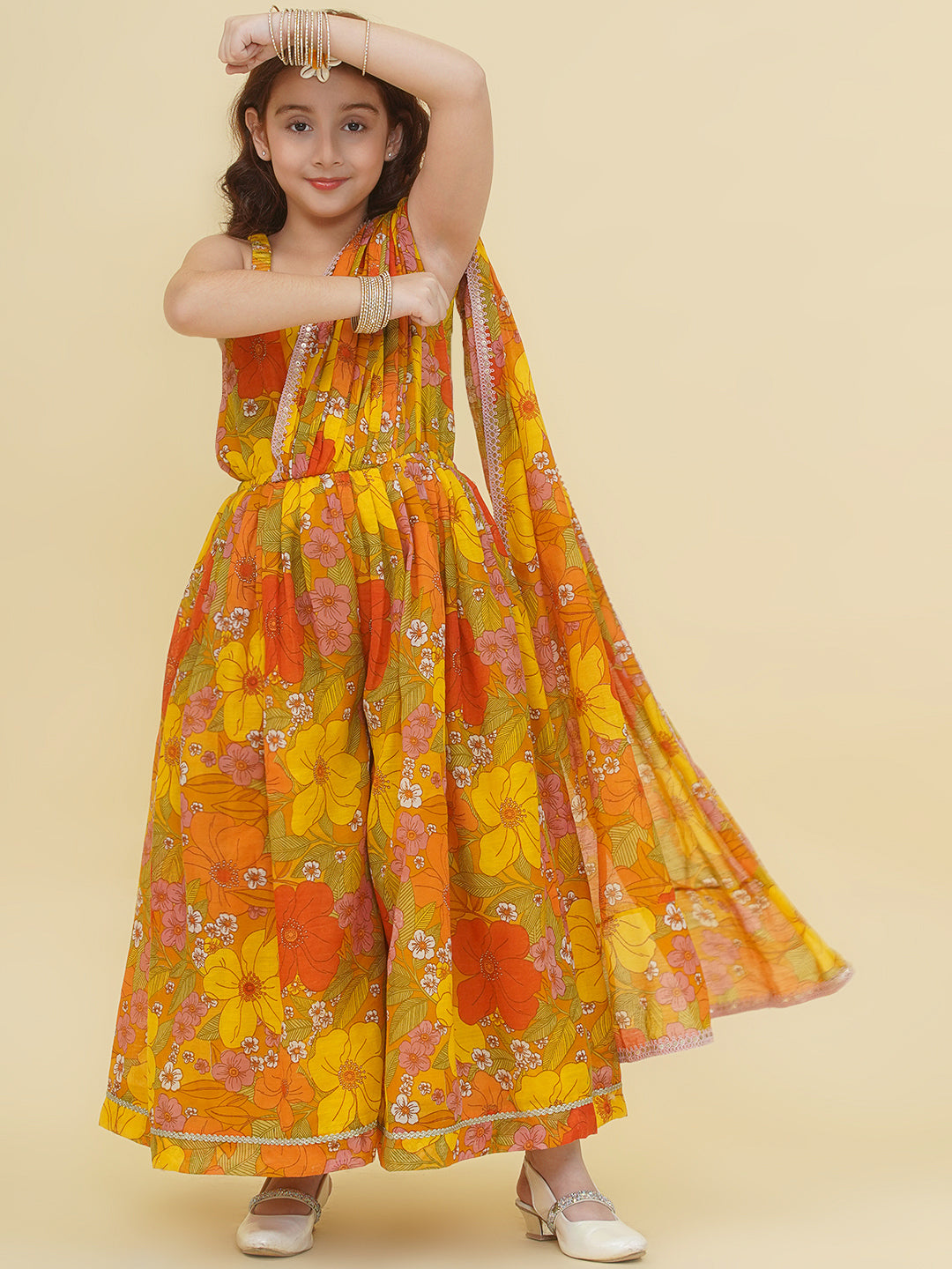 Yellow & Multi Flower Design Fit & Flare has a Lace work Off-Should Neck, has a Sleeveless Jumpsuit Maxi length in flared hem.