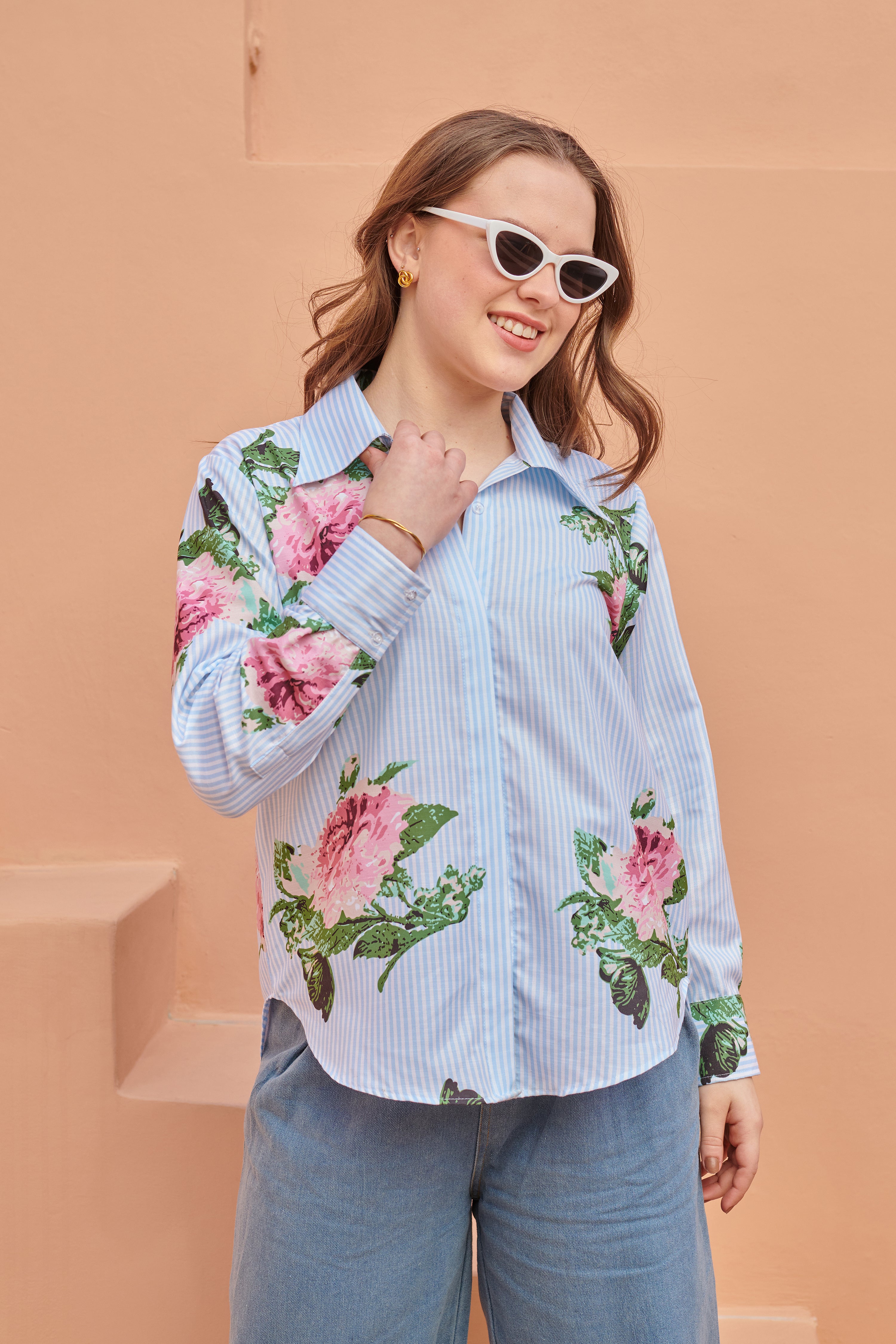 Blue and white striped shirt with florals, featuring Pasha’s signature print. A timeless classic.