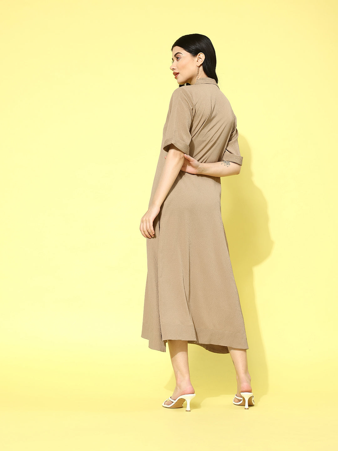 Beige solid shirt collar, short sleeves,A line calf length dress