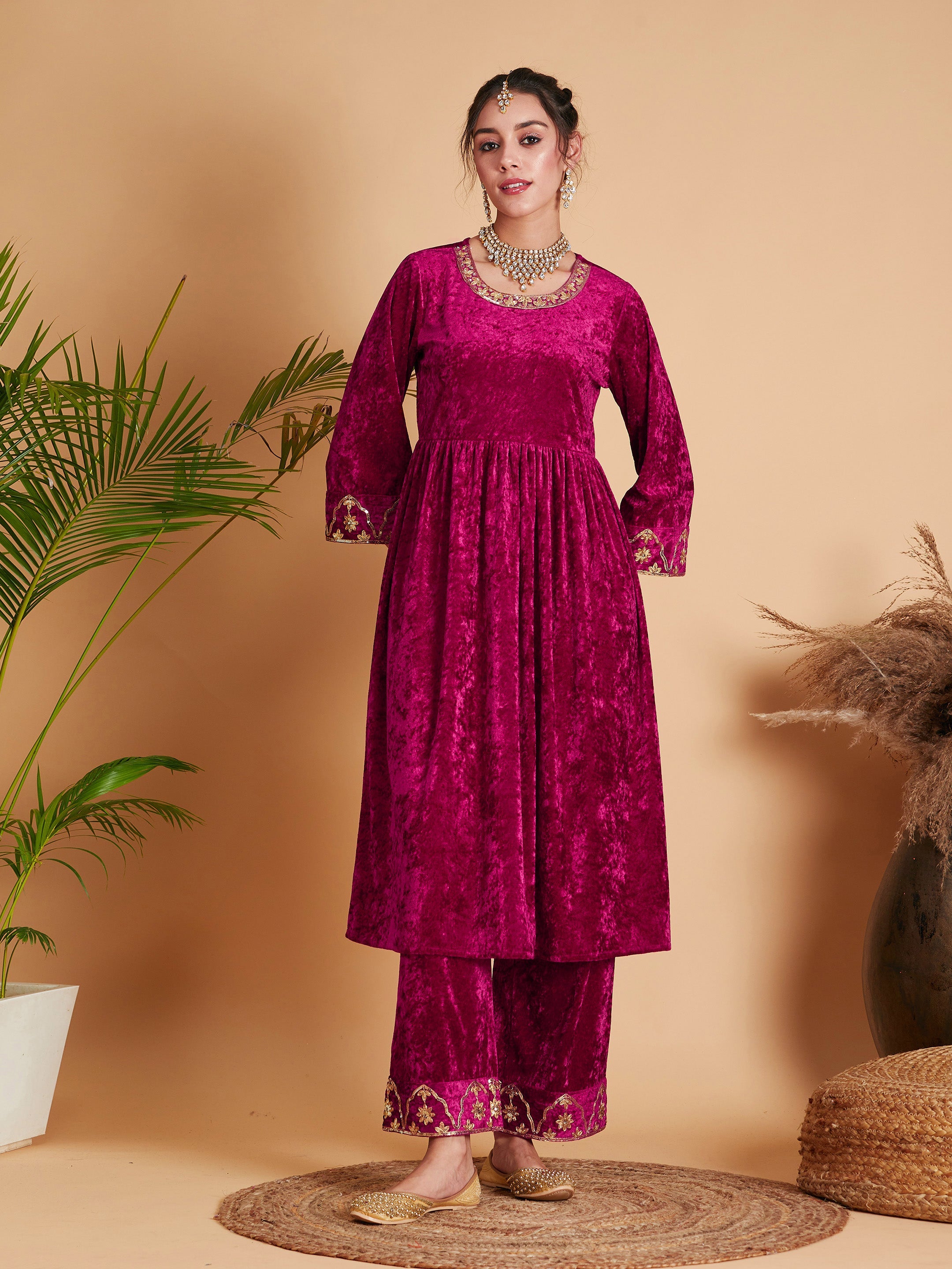 Fuchsia Velvet Embroidered Straight Pants, in Velvet fabric, Unlined, Ankle Length, Straight Fit, Elasticated Waistband, Straight Hemline and features Embroidery Detail At Hem
