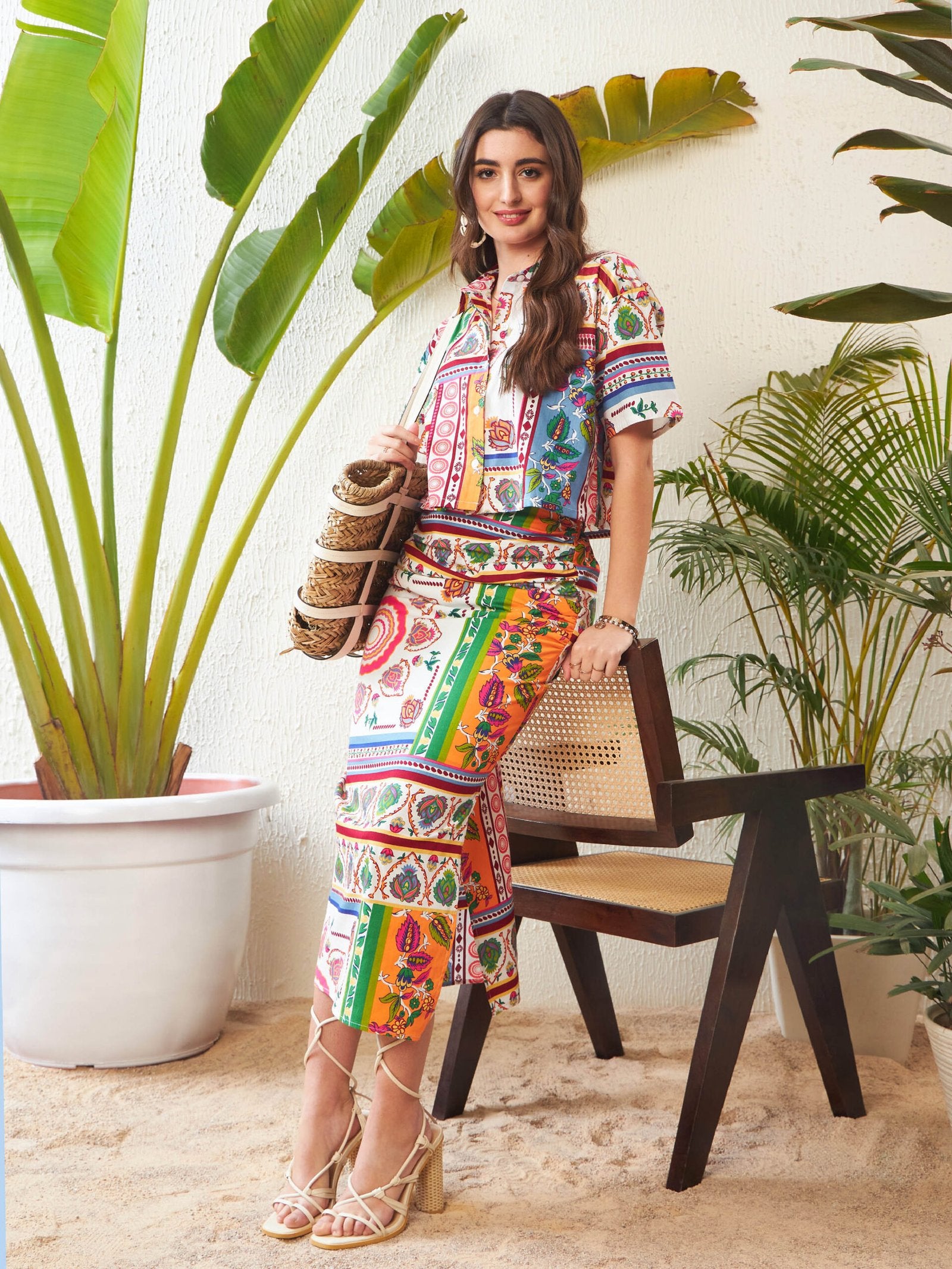 Multi Patch Crop Shirt With Side Ruched Maxi Skirt, in Poplin fabric, Cotton, Crop, Boxy Fit/ Regular Fit, Button Closure, Straight Hemline and features Plastic Button Closure /Slit At Side | Model Info: Model Info: Model is wearing size S Model Chest - 33" Waist - 27" Height - 5'8" | Specifications: