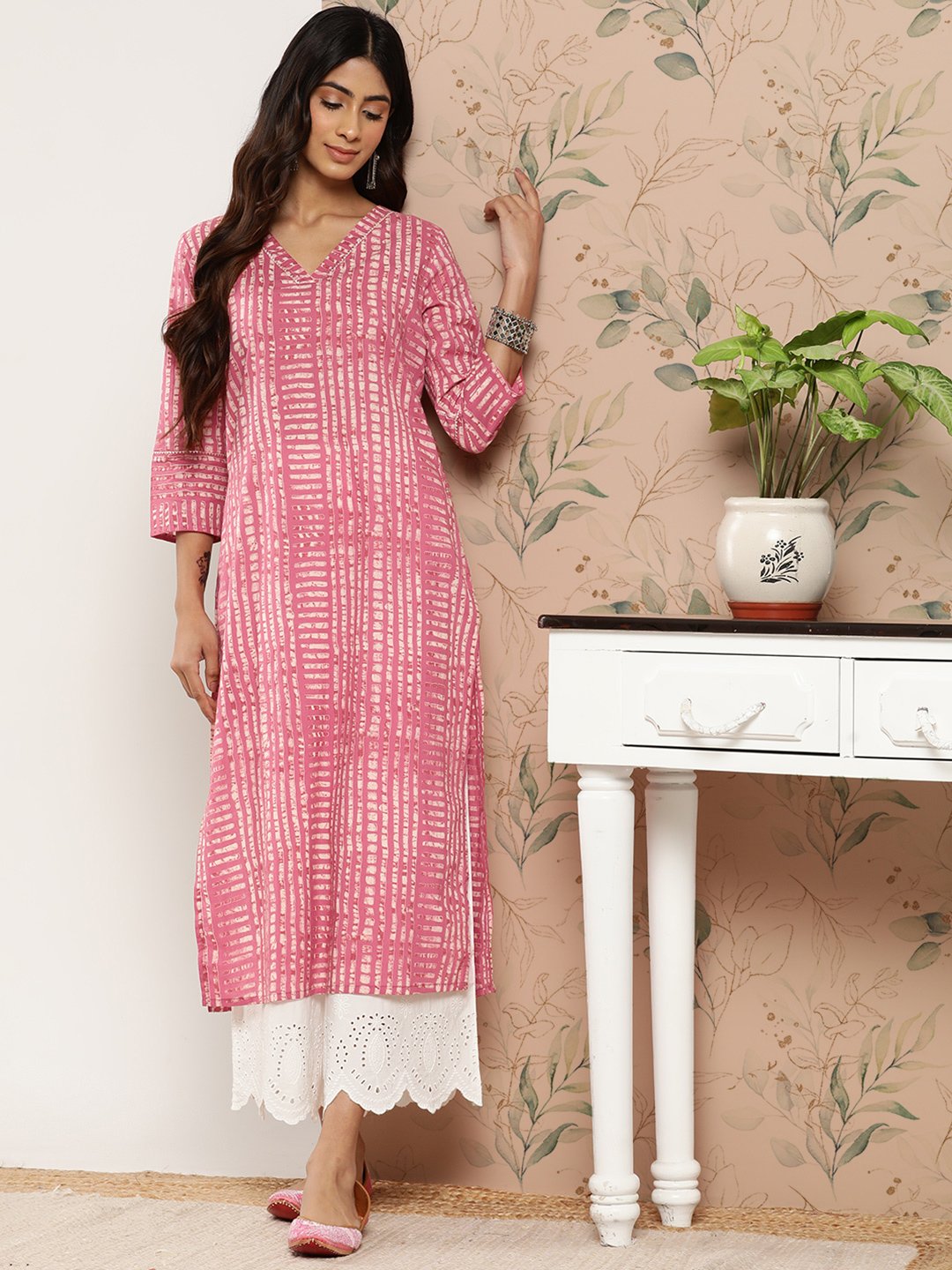 Pink 3/4Th Sleeve, V Neck, Printed Straight Kurta With Side Slits And Gota Detail At Sleeve And Neck.