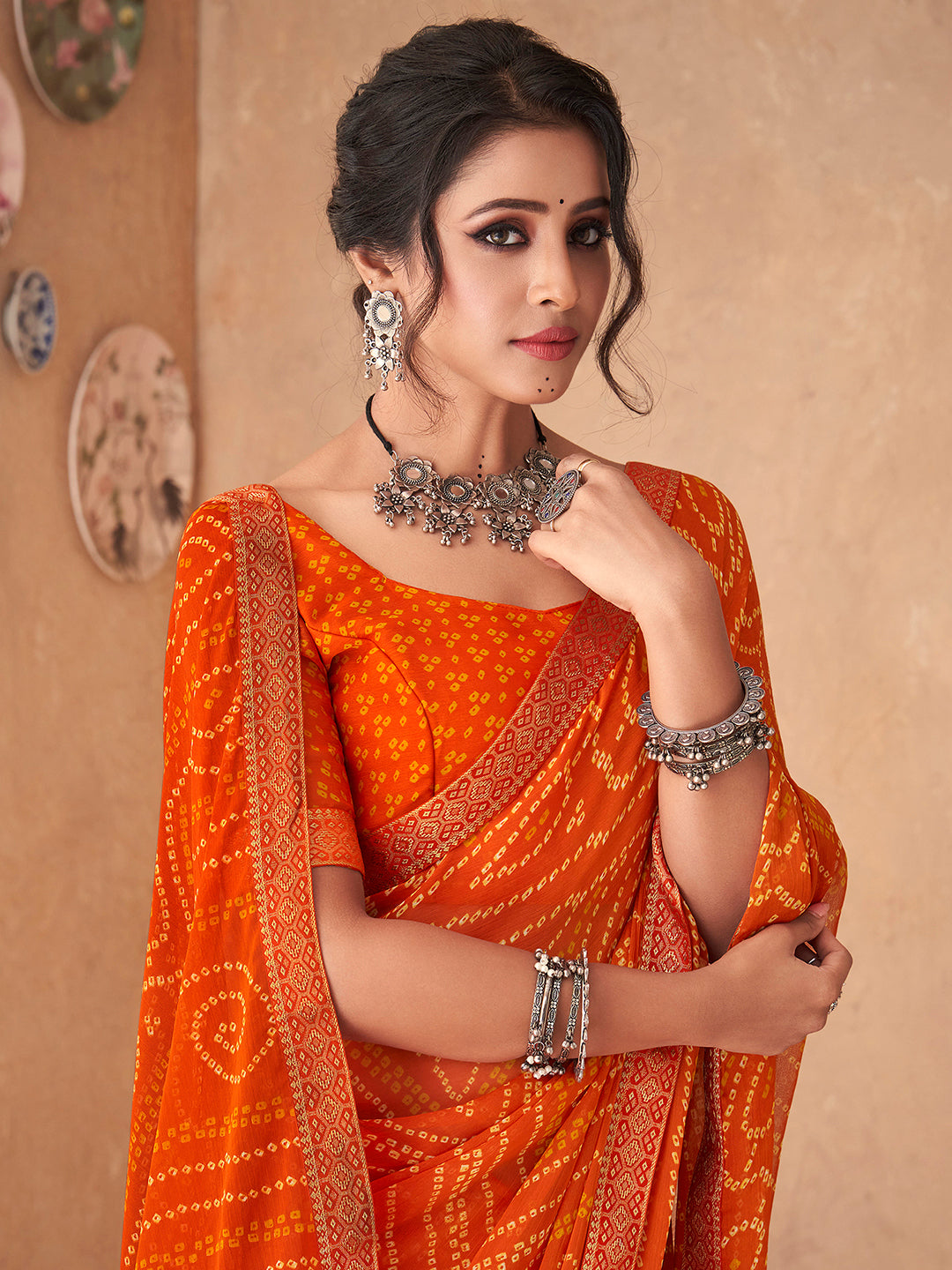 This saree from the house of SAREEMALL is made from Chiffon and is Orange in color. SAREEMALL Ethnic Sarees comes With Blouse Piece, Which can be Stitched according to Your Taste and Preference. This Saree is Crafted by Skill Craftsmen without Compromising on its Quality. With This Beautiful Design and Fabric, This Saree will fetch You Oodles of Compliments and Praise. saree fit size is 5.5 mtr saree & 0.8 mtr blouse, Free Size |CHIFFONBANDHNISAREEATTACHEDWITHBANARSIBORDER..