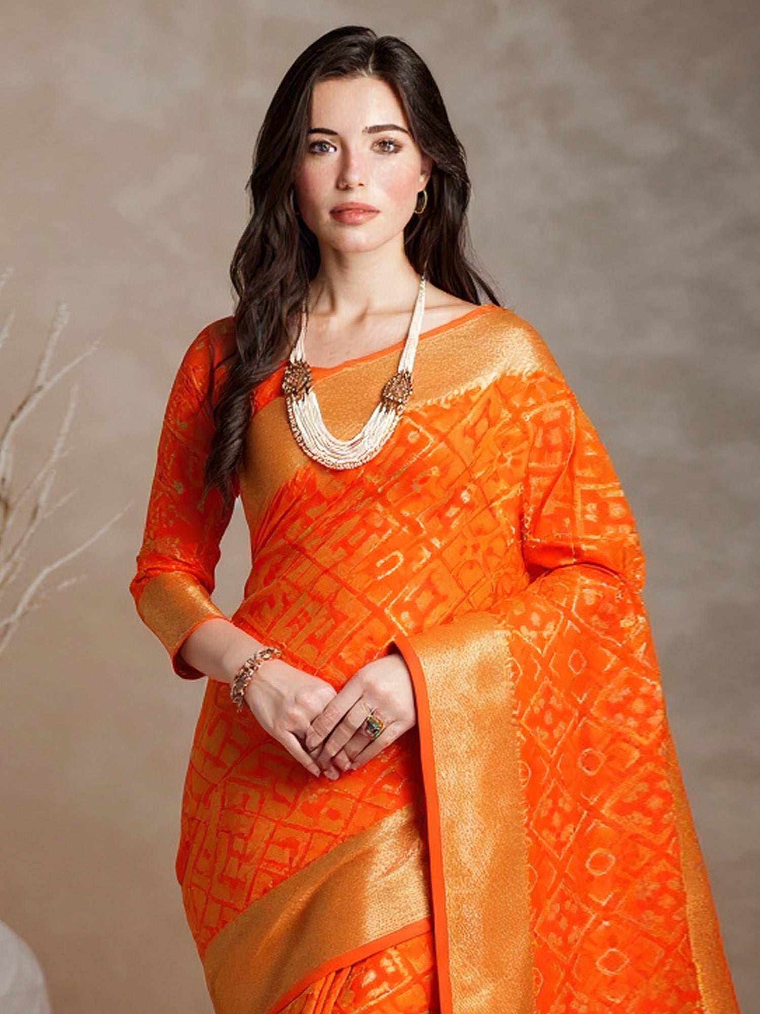 This saree from the house of SAREE MALL is made from Silk Blend and is Orange in color. SAREE MALL Ethnic Sarees comes With Blouse Piece, Which can be Stitched according to Your Taste and Preference. This Saree is Crafted by Skill Craftsmen without Compromising on its Quality. With This Beautiful Design and Fabric, This Saree will fetch You Oodles of Compliments and Praise. saree fit size is 5.5 mtr saree & 0.8 mtr blouse, Free Size |.