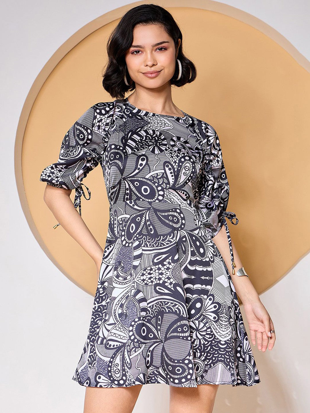 Length of dress - Above Knee, Shape - A-Line, Fabric - Polyester, Colour - Black, Work/Pattern - Printed, Neck Line - Round Neck