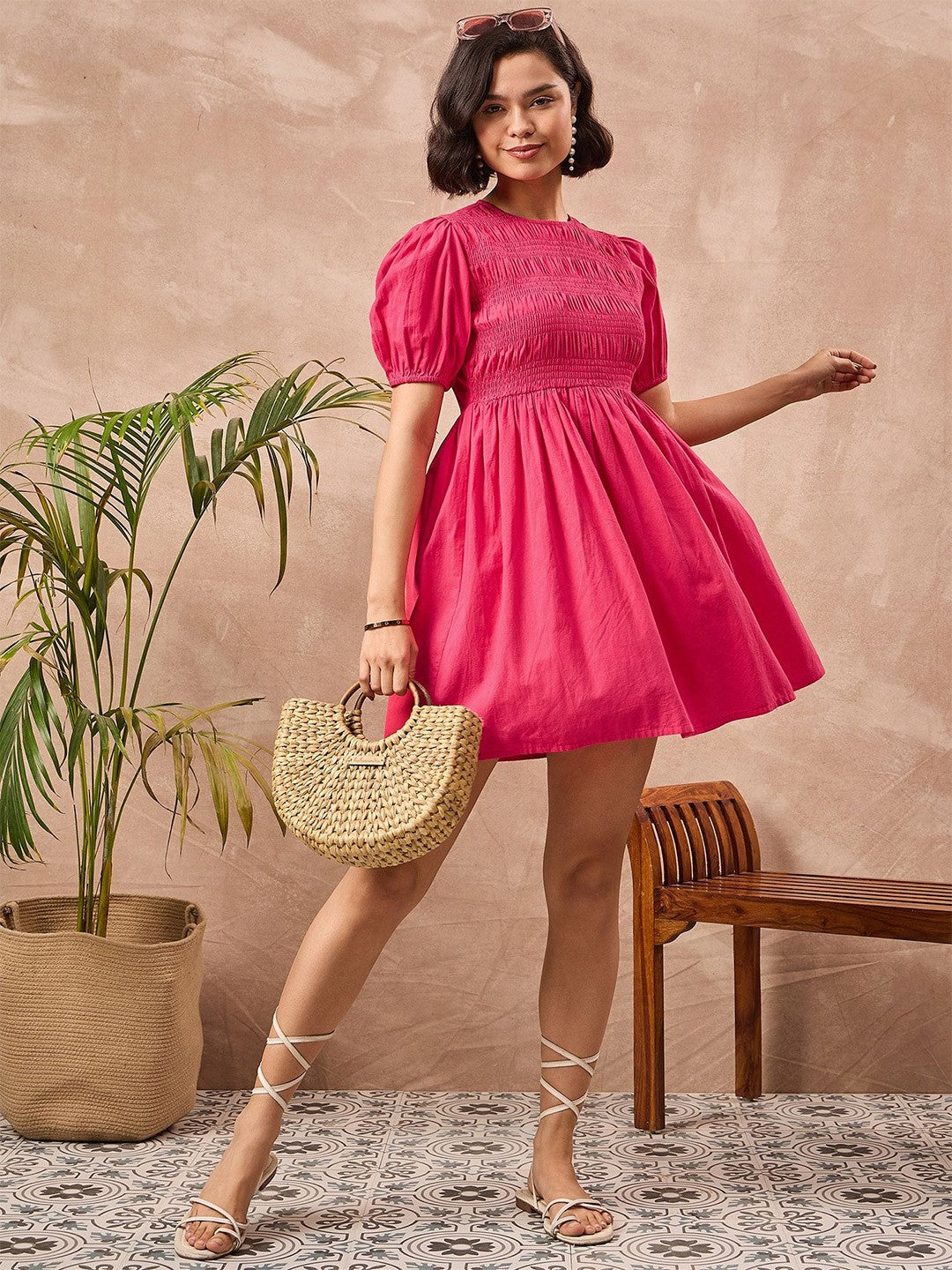 Length of dress - Above Knee, Shape - Fit and Flare, Fabric - Cotton, Colour - Magenta, Work/Pattern - Solid, Neck Line - Round Neck
